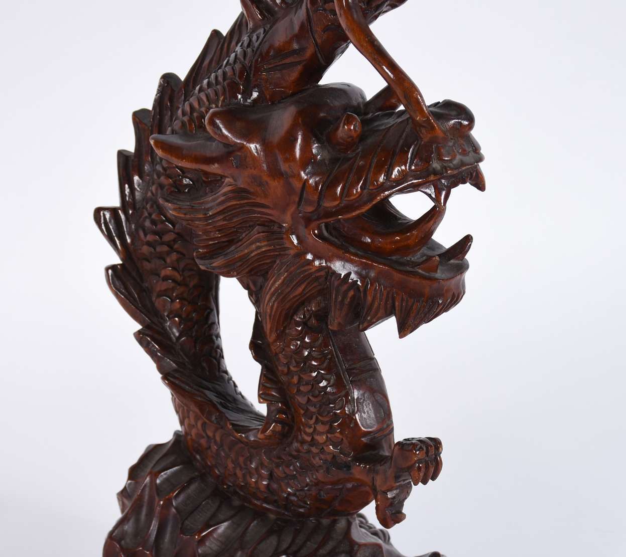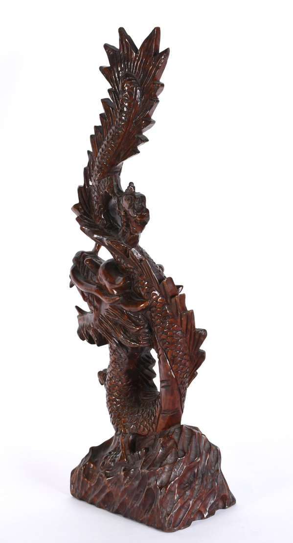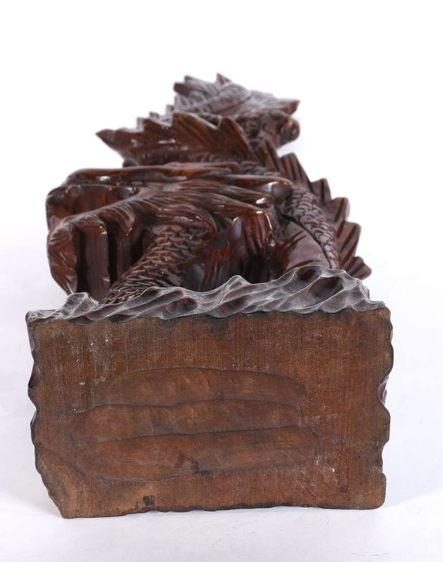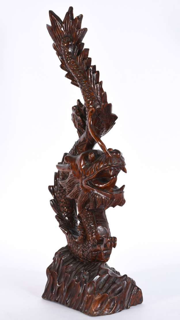 Escultura de madeira entalhada chinesa representando dragão.