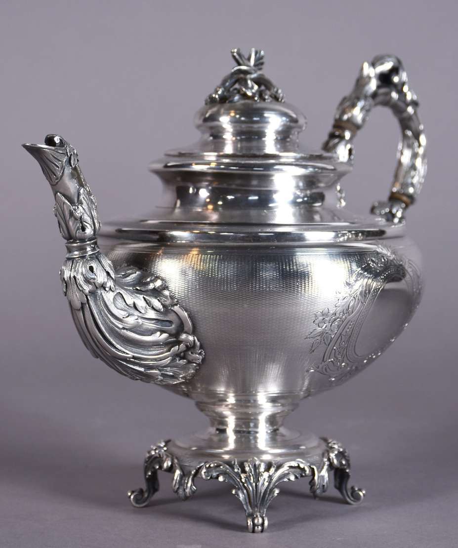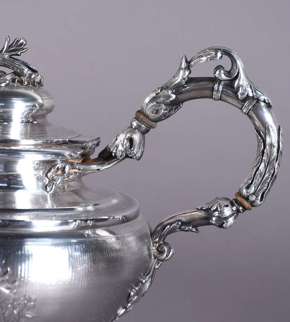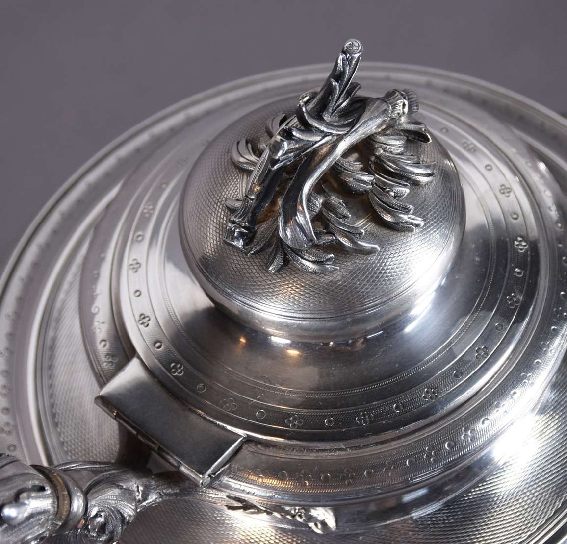 Tinteiro de prata de lei contrastada, tres recipientes sendo dois com tampas e um encimado com sineta cinzelada, gale...