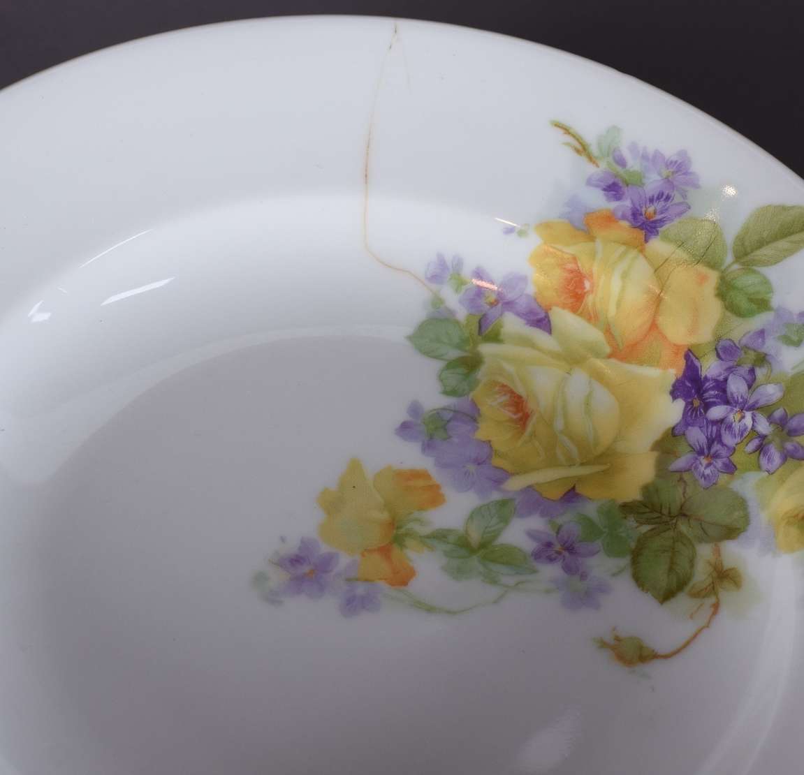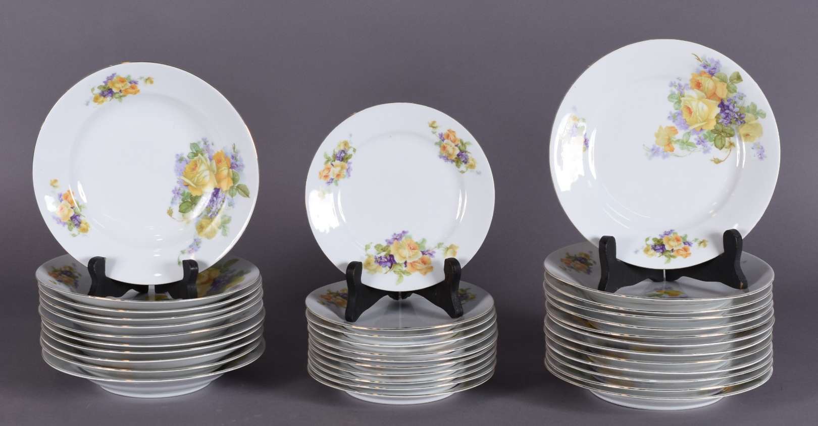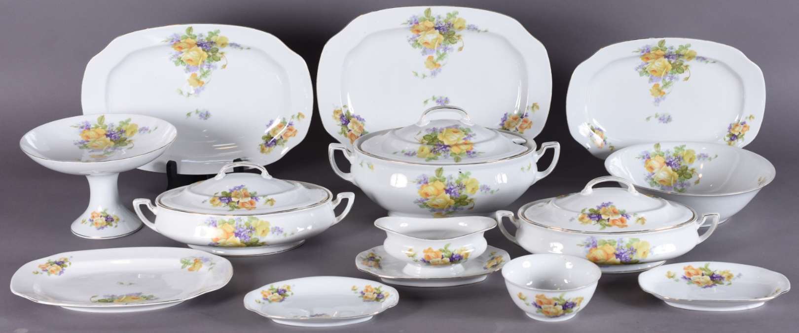 Serviço de jantar de porcelana francesa finamente decorada com pequenas flores em policromia e guirlandas verdes nas ...