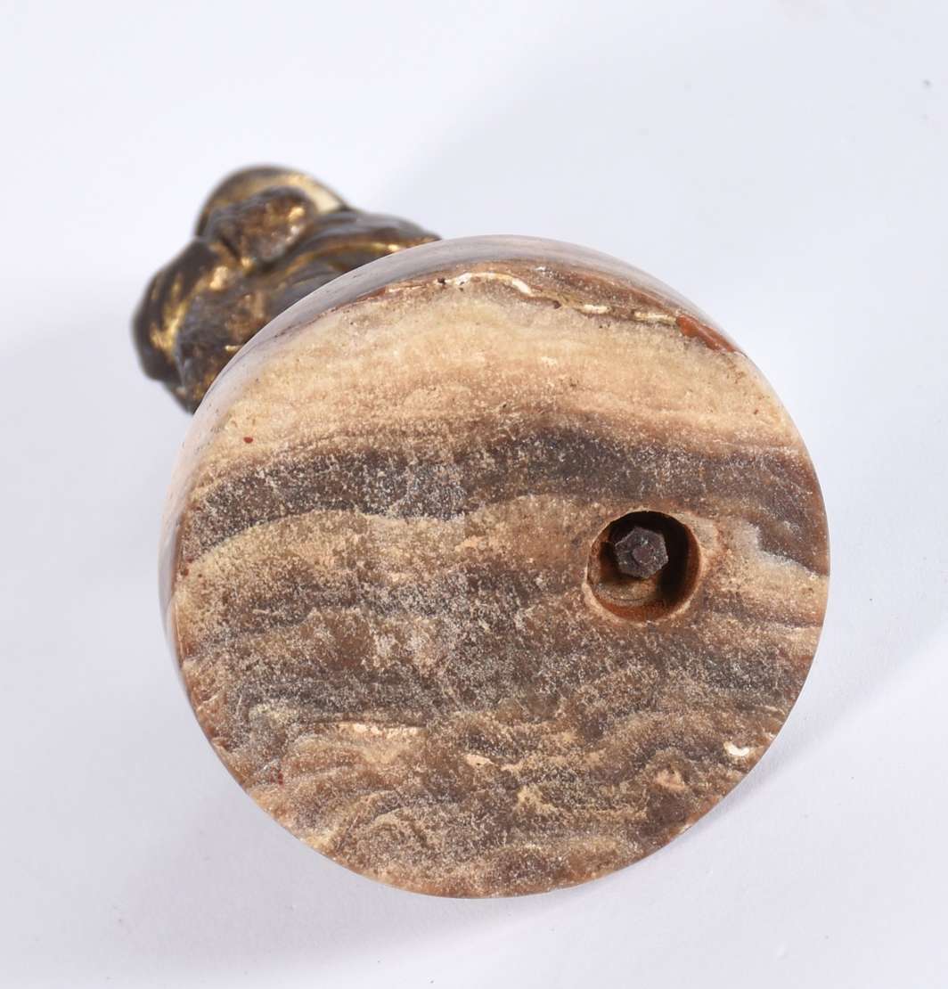 Escultura de marfim representando sábio com cajado e pêssego, fruto este originário da China. Base de madeira.Curiosi...
