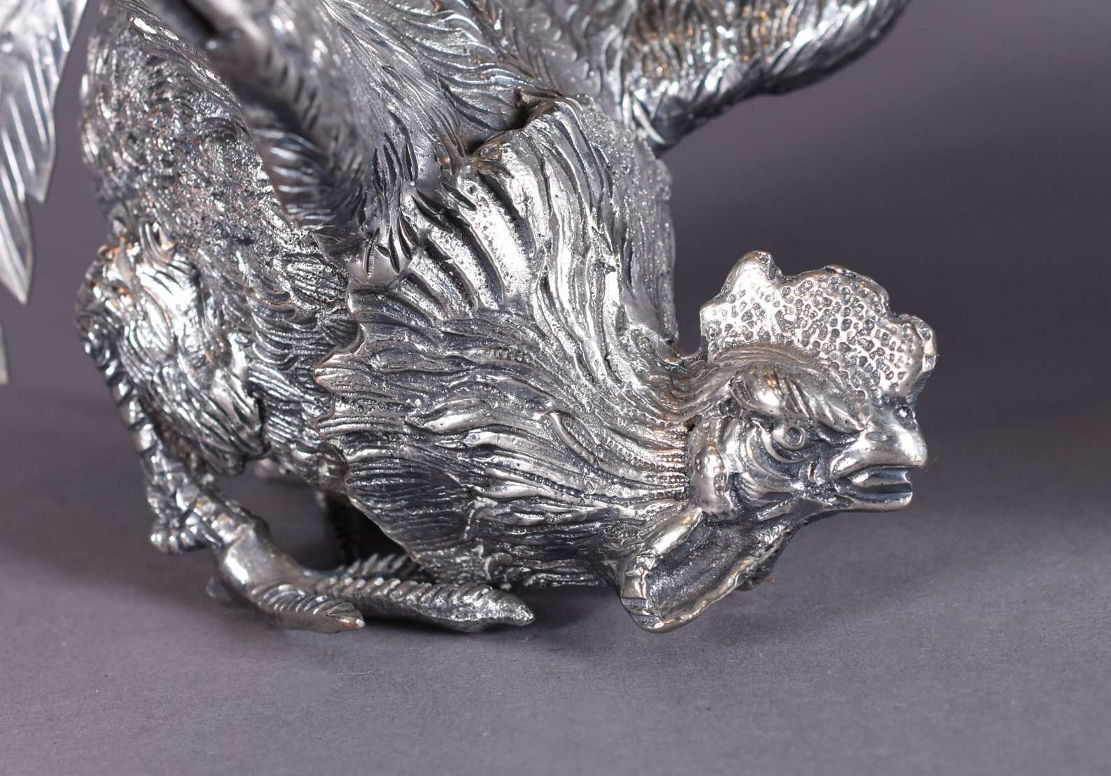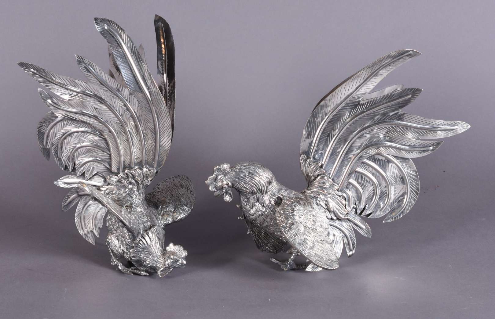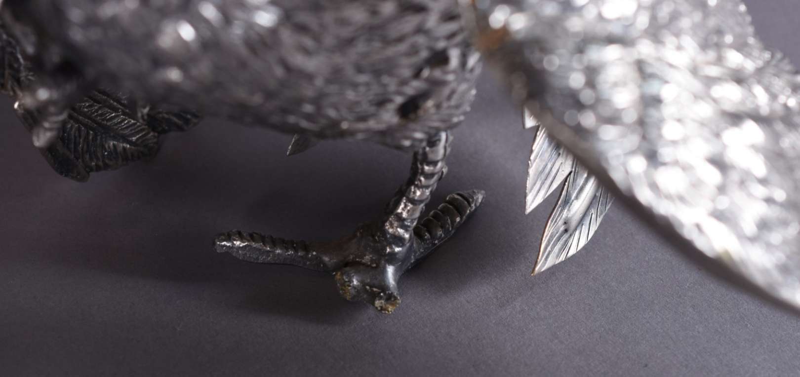Três esculturas de metal, sendo um cavalo e 2 codornas.