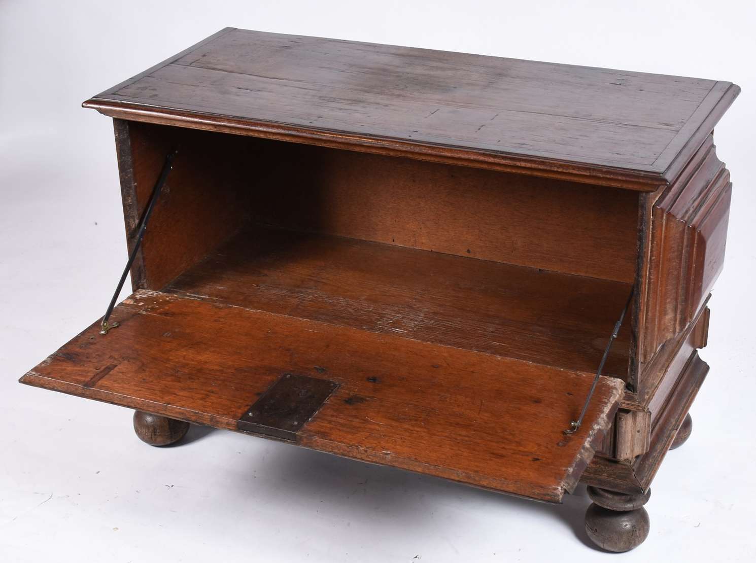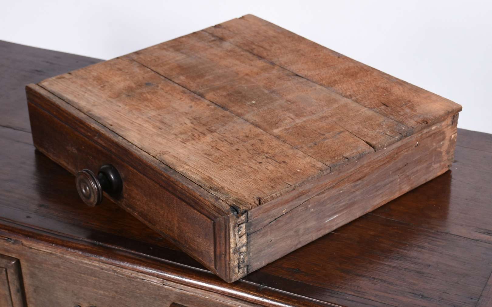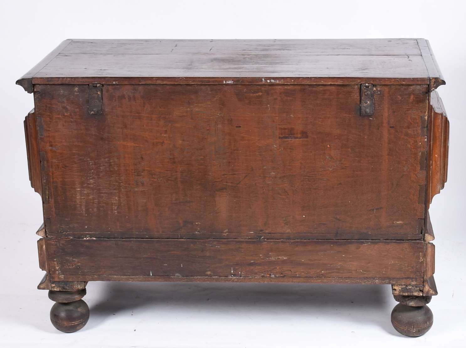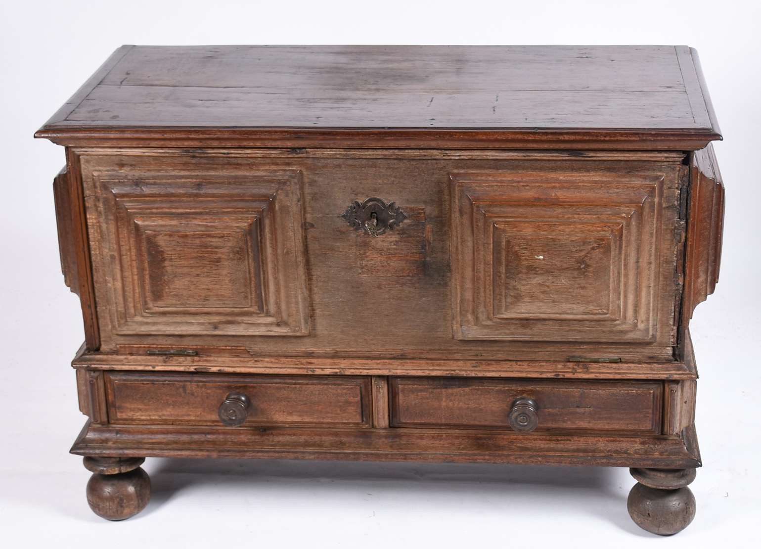 Arca de madeira nobre com 2 portas almofadadas e 2 gavetas com puxadores de metal, prateleira interna (pequenos desga...