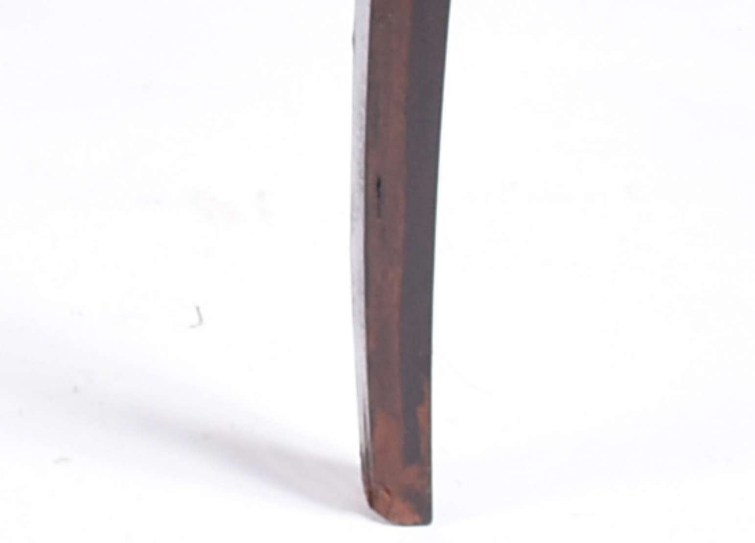 Par de antigas cadeiras singelas de madeira nobre, encostos divididos por traves recurvas e partes superiores que ult...