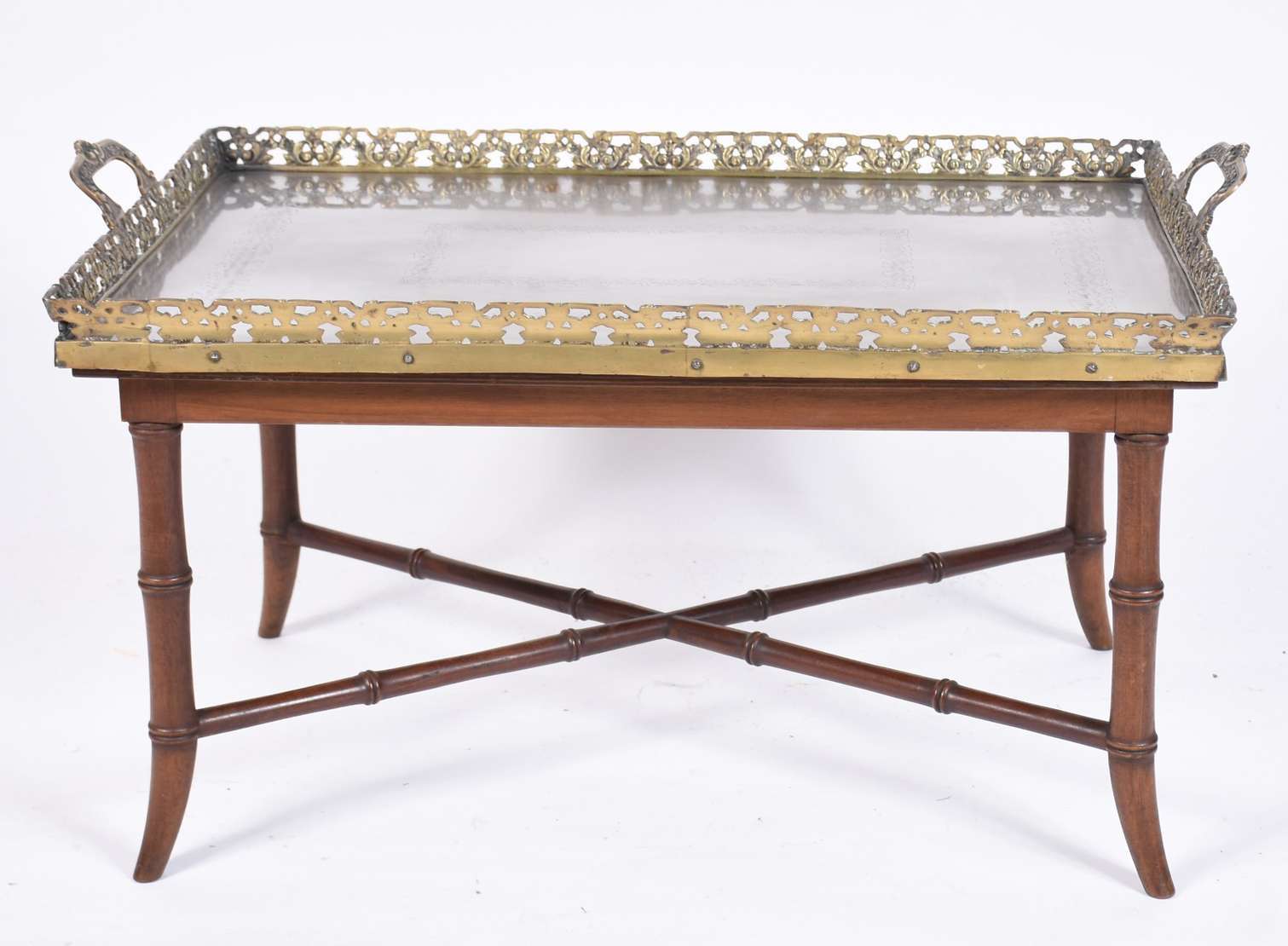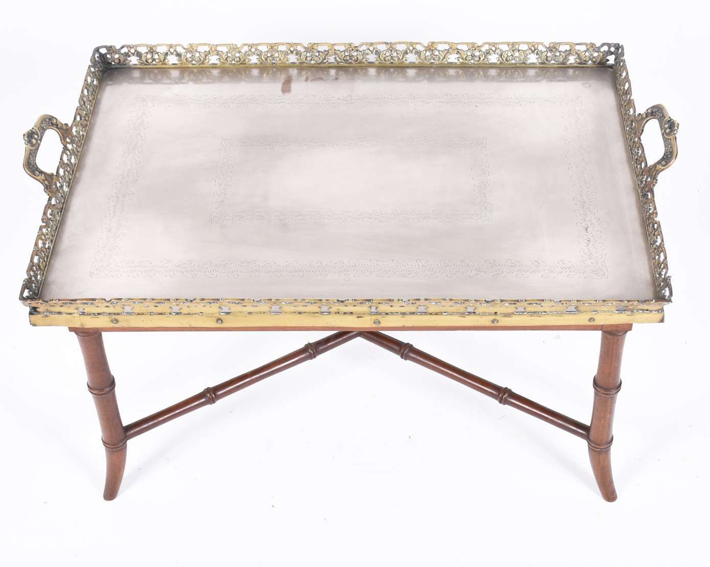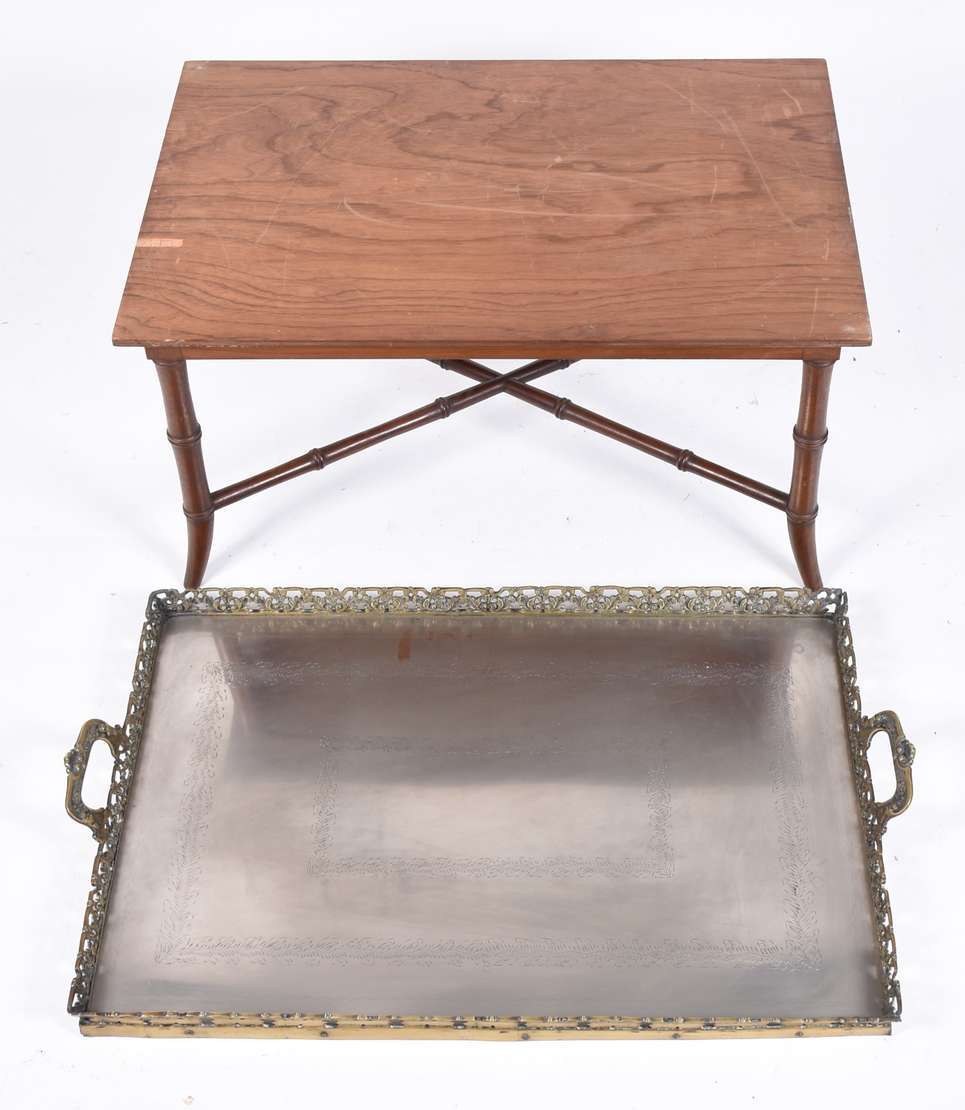 Mesa auxiliar estilo frances de madeira aglomerada com folheado soltando, gradinha de metal. (precisando restauro).