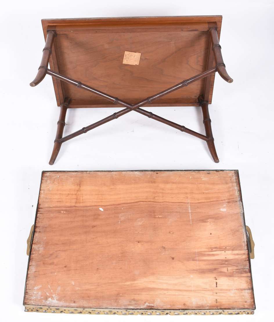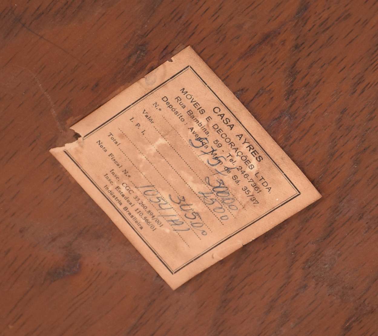 Mesa de madeira nobre com abas, pernas cilíndricas ligadas por traves retas laterais. Faltando suporte que apoia uma ...