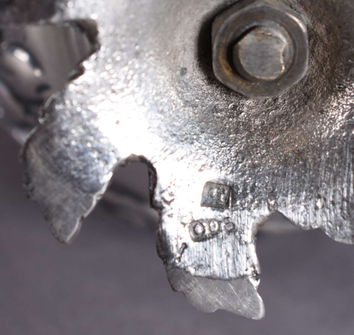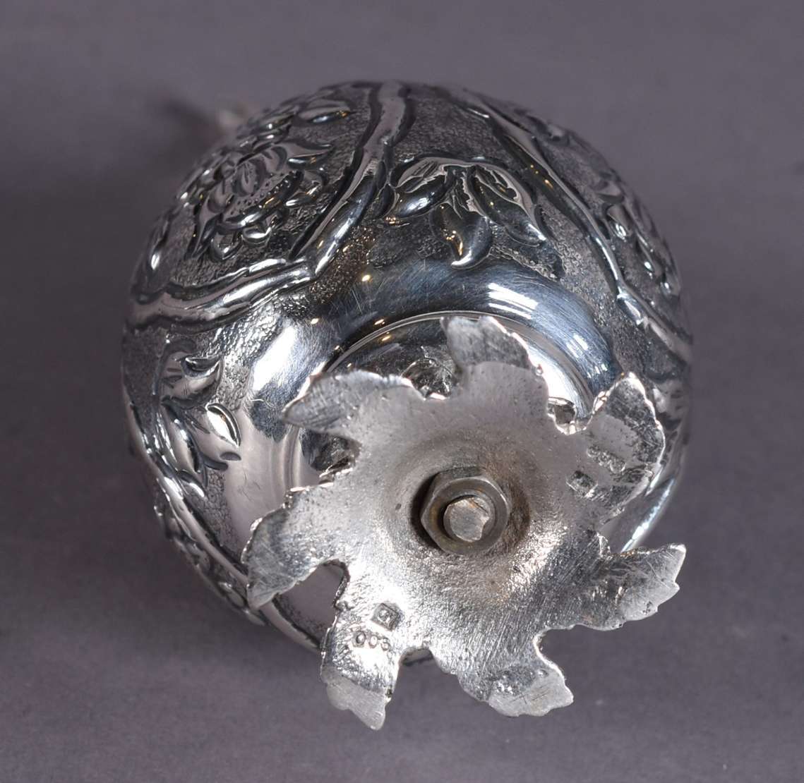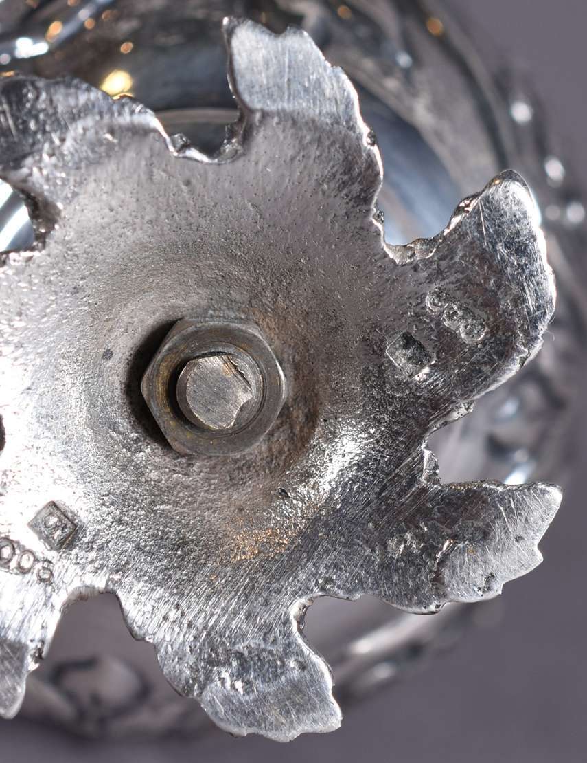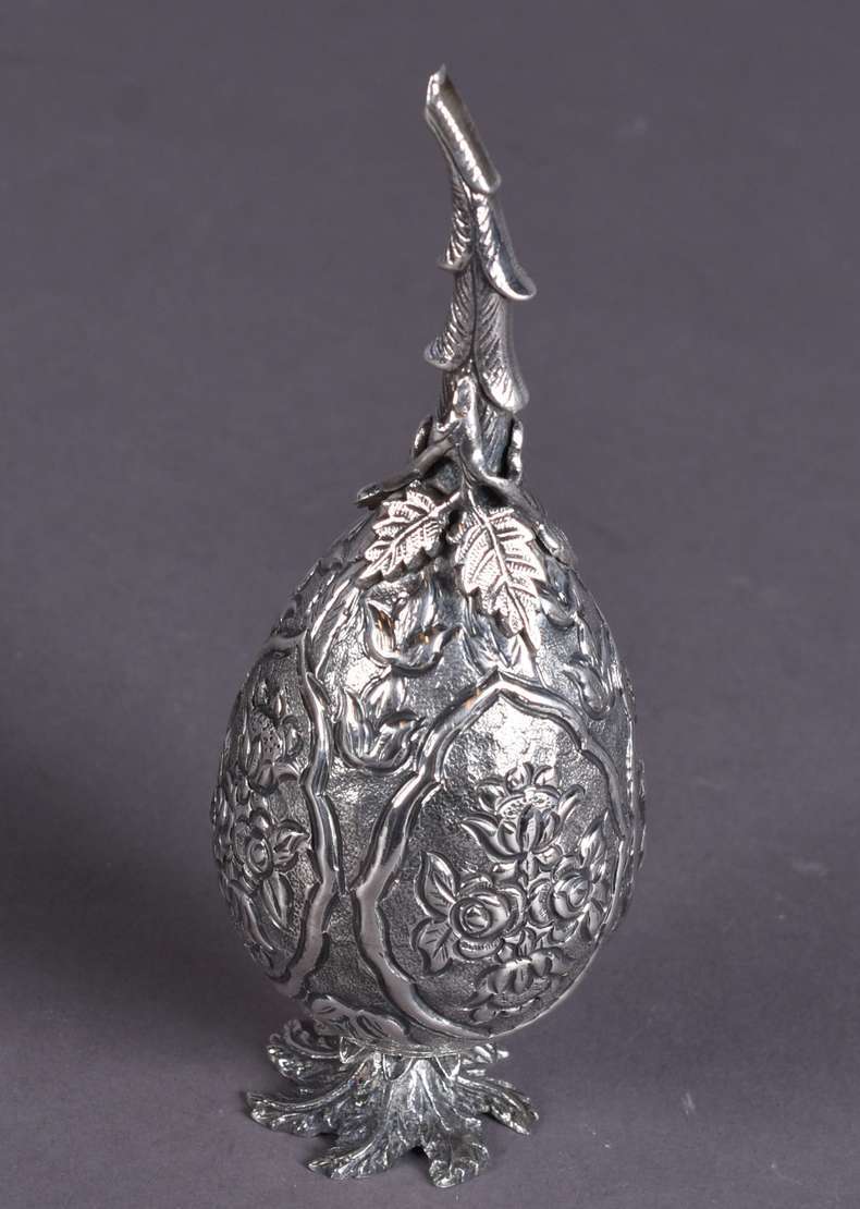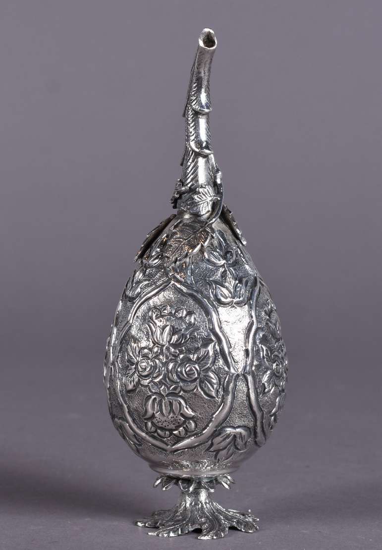 Xícara de prata francesa com caneluras, e base ovalada com apoio para petit-four, contraste cabeça de minerva. Peso d...