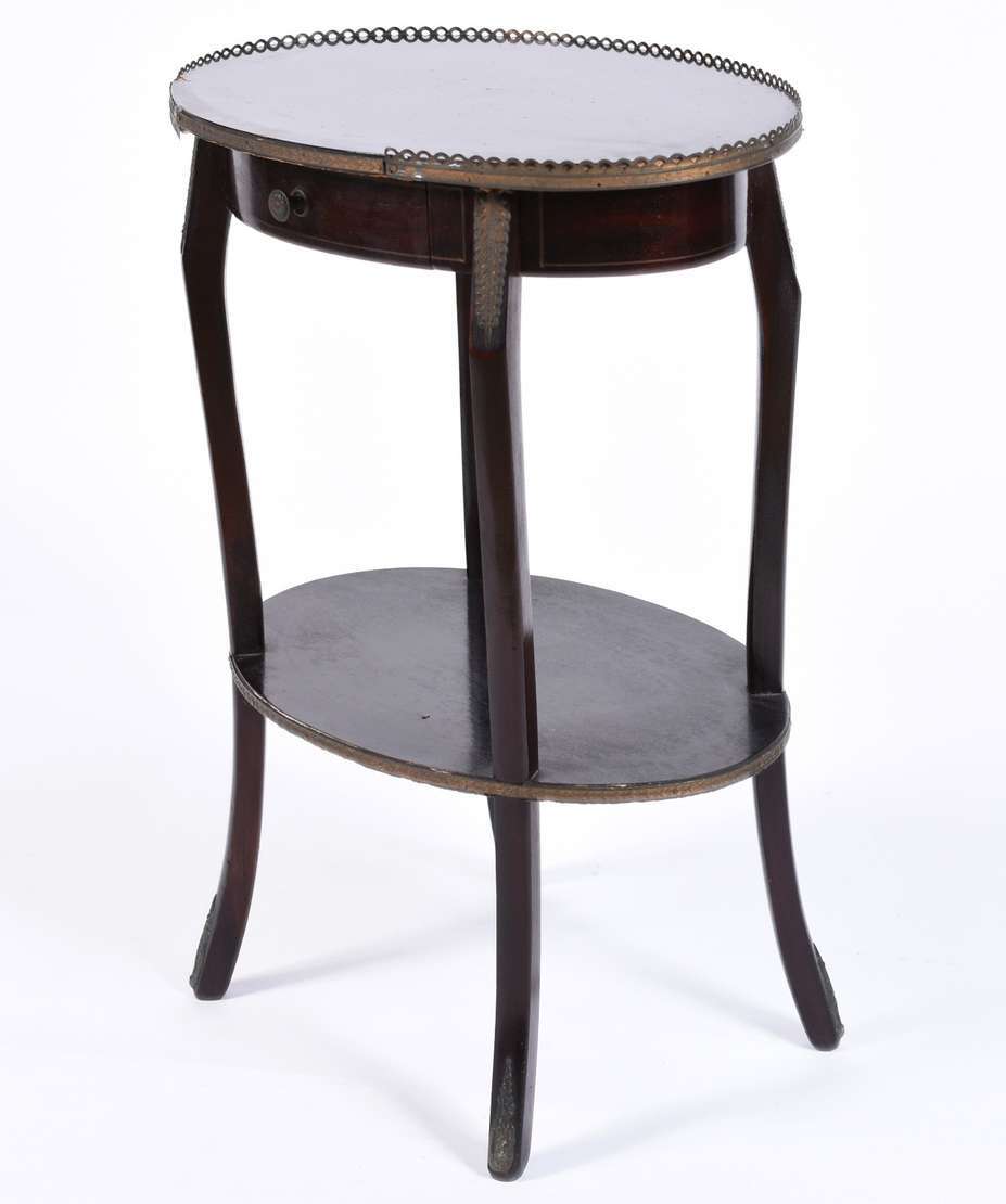 Mesa oval de madeira nobre, estilo frances, trabalho em marqueterie floral com 2 gavetas, galeria de metal vazado.