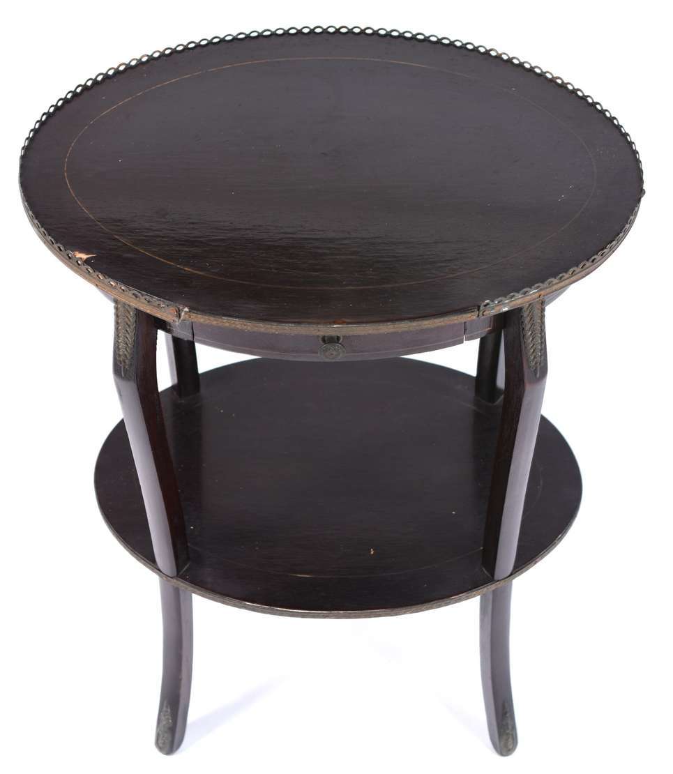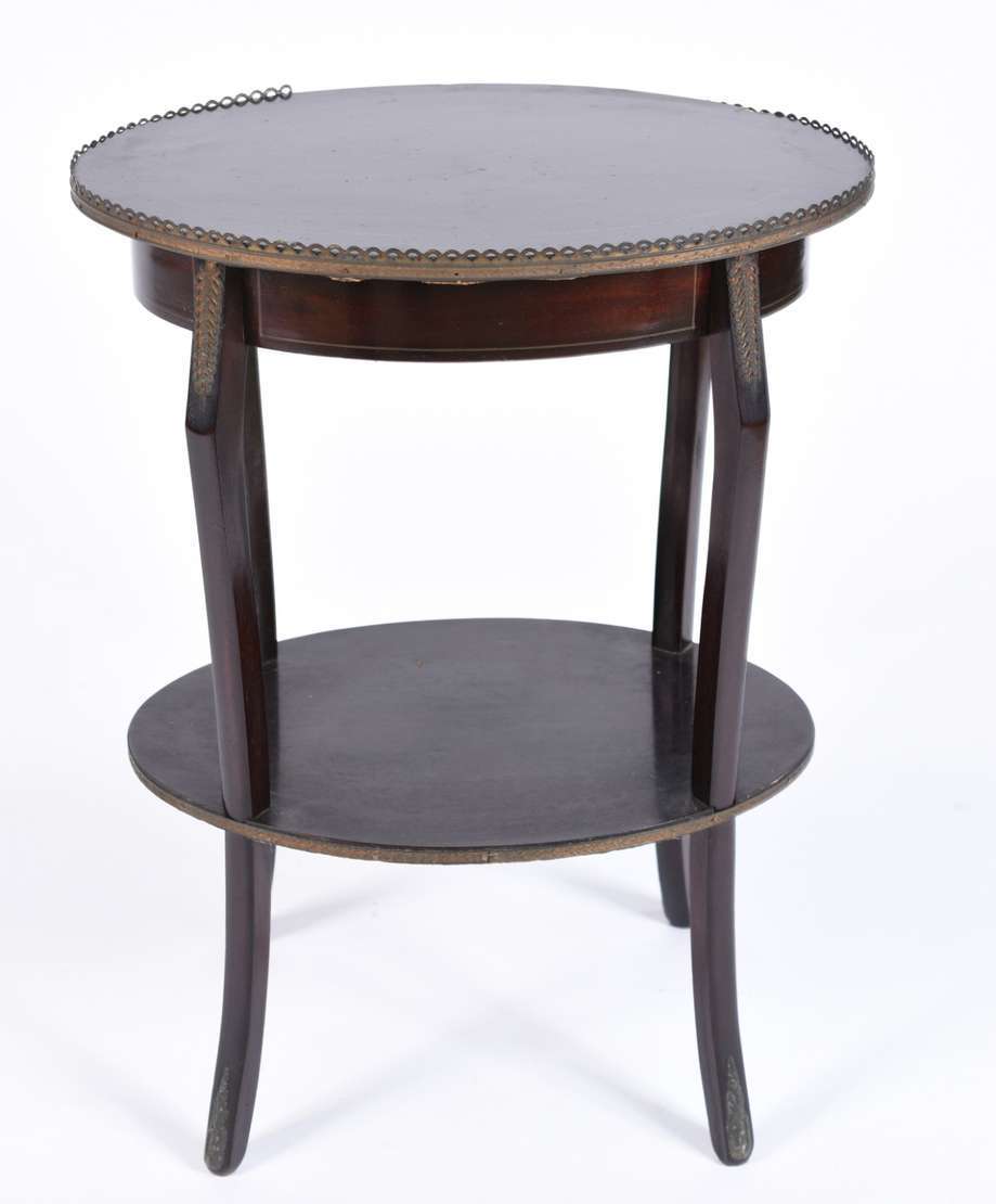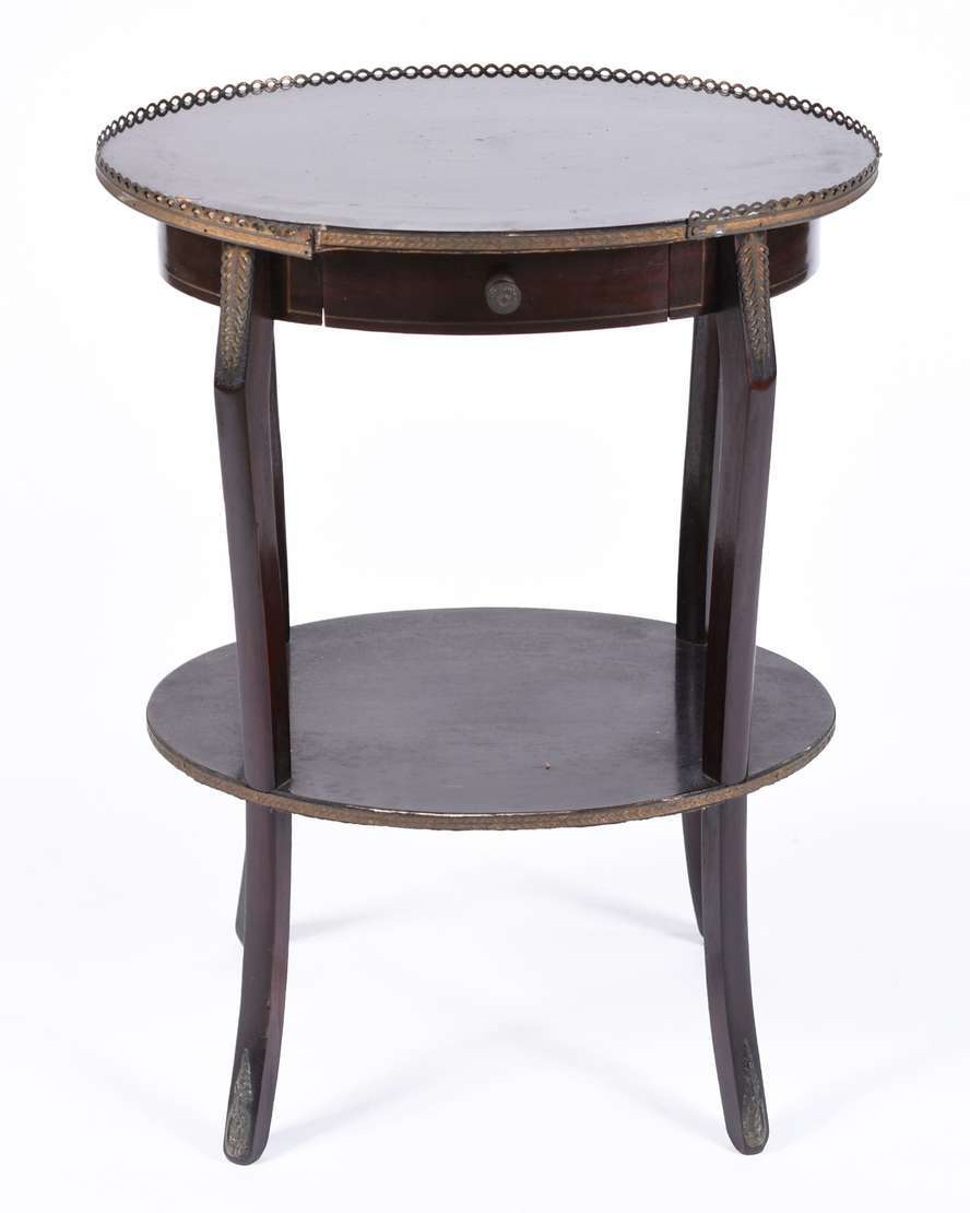 Mesa redonda auxiliar de madeira nobre, saia recortada, base feitio tripé.