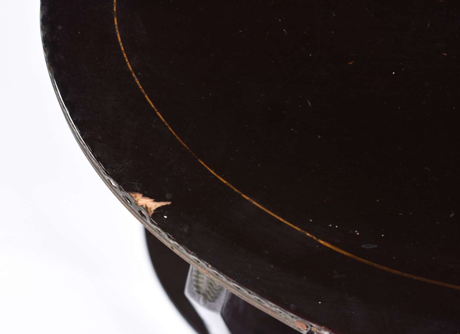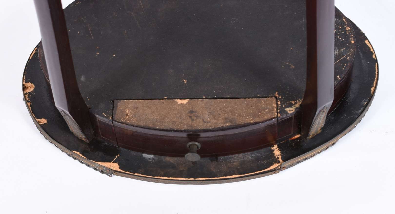 Mesa de madeira nobre com abas, pernas cilíndricas ligadas por traves retas laterais. Faltando suporte que apoia uma ...
