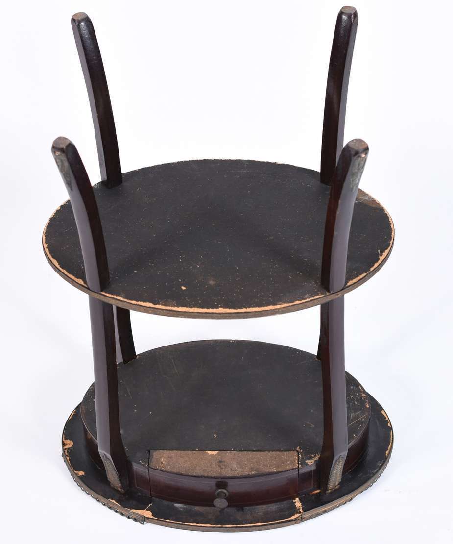Mesa auxiliar der madeira nobre com uma gavetinha, saia canelada, apoio em 4 colunas torneadas ligadas por pequeno pl...