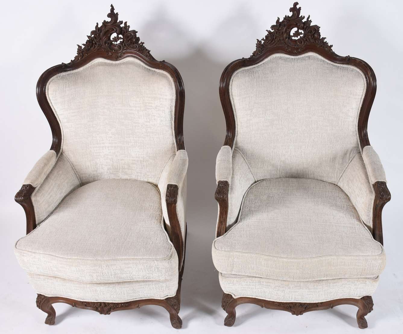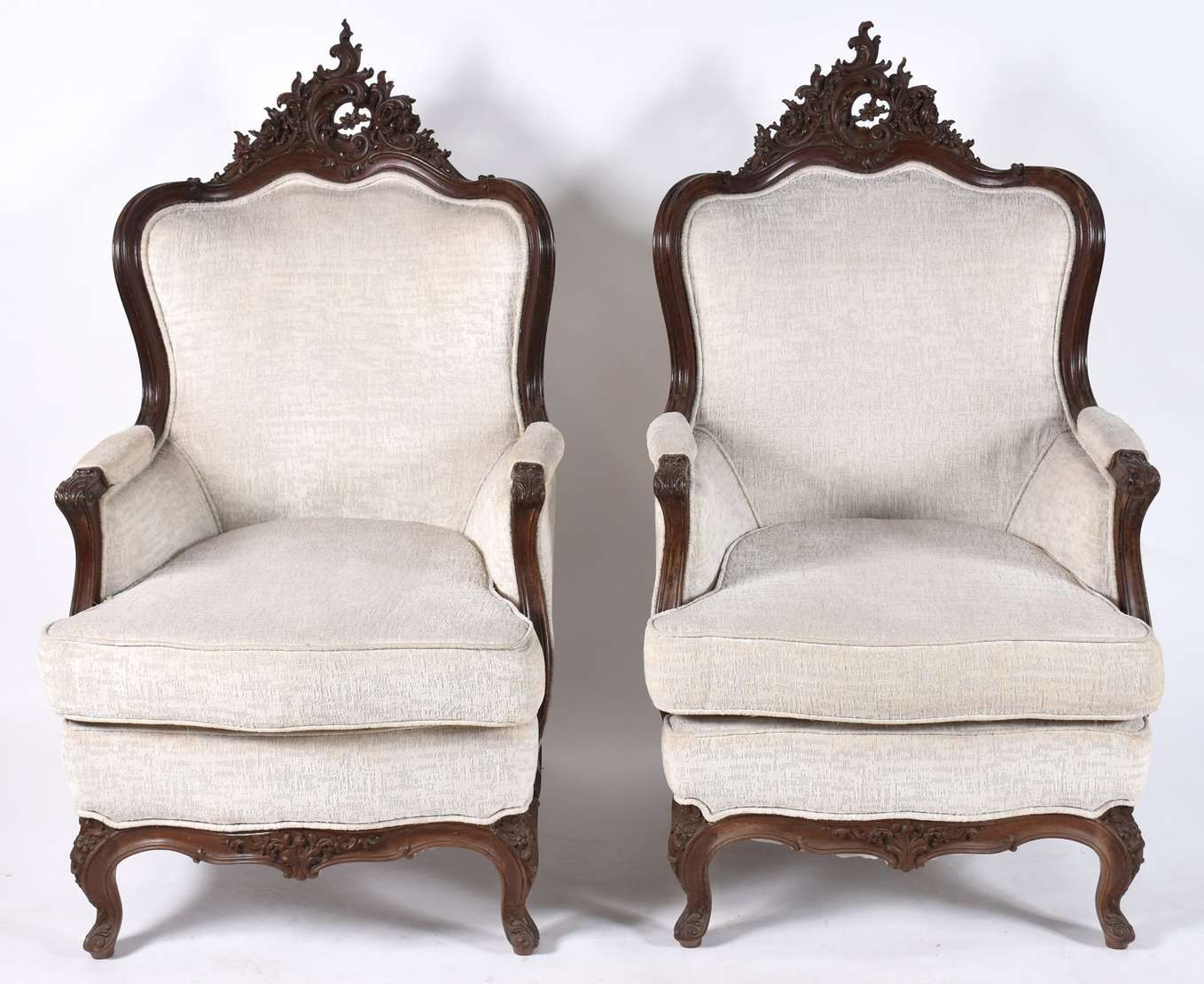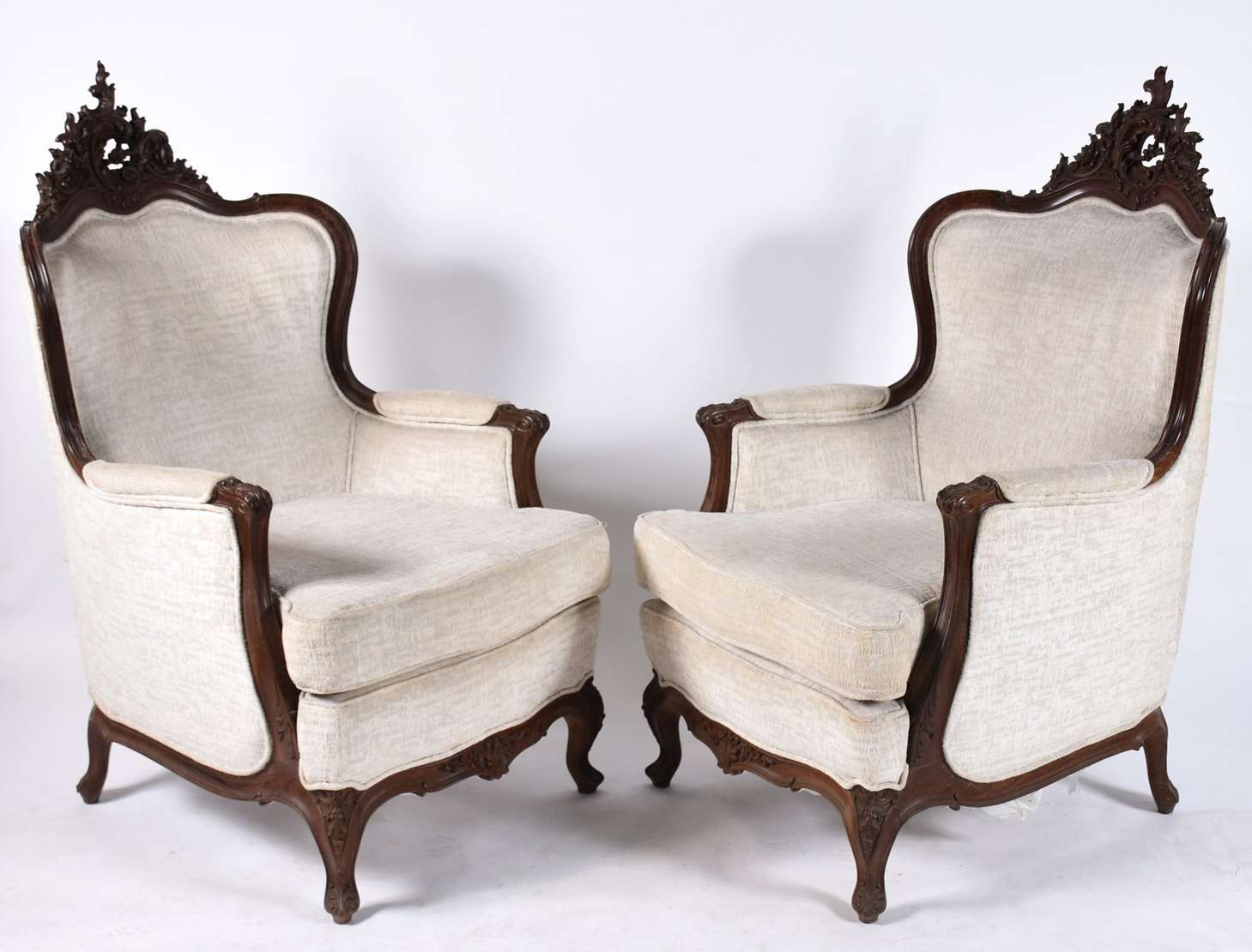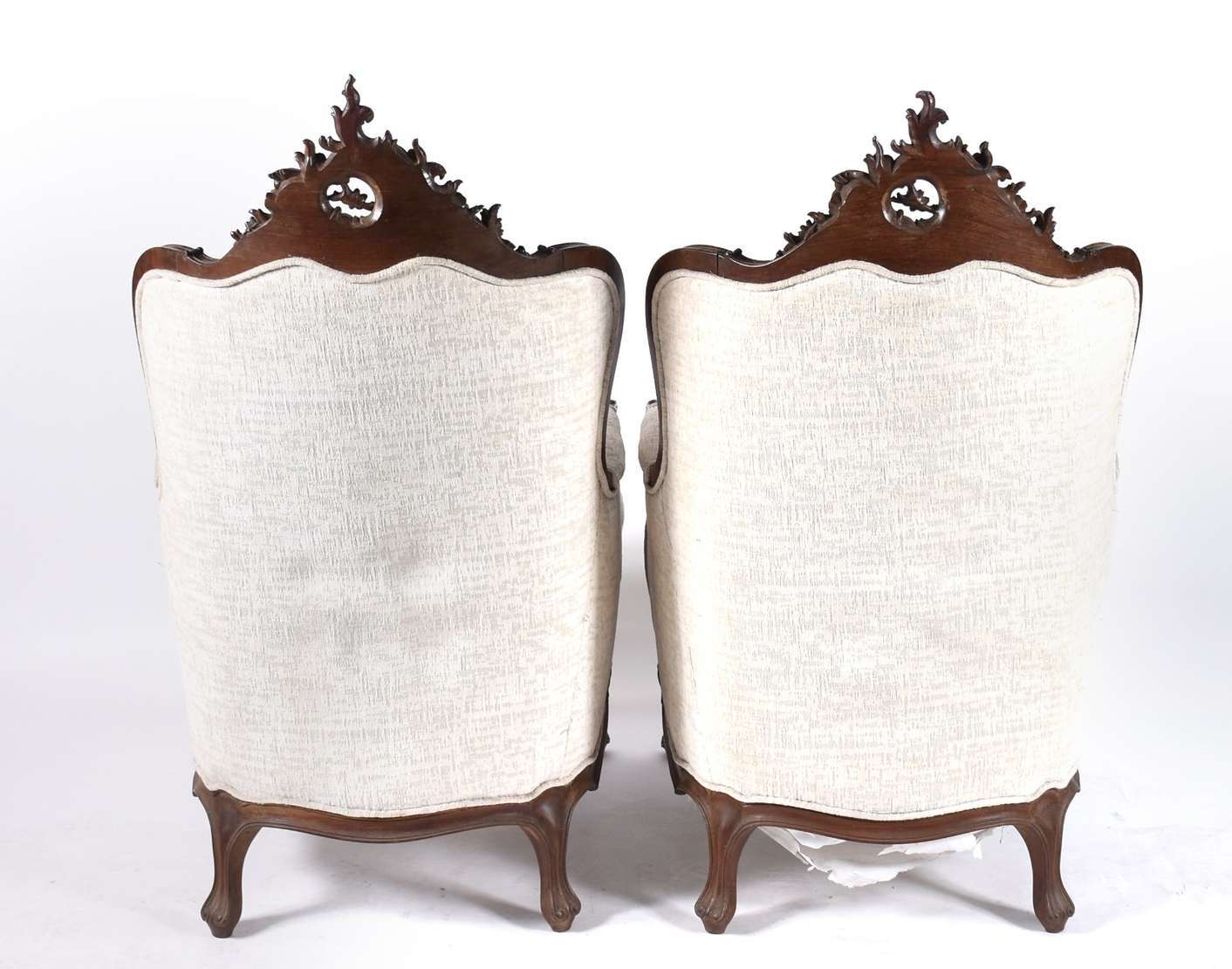 Par de cadeiras com braços de madeira nobre no estilo oriental, almofadas soltas.