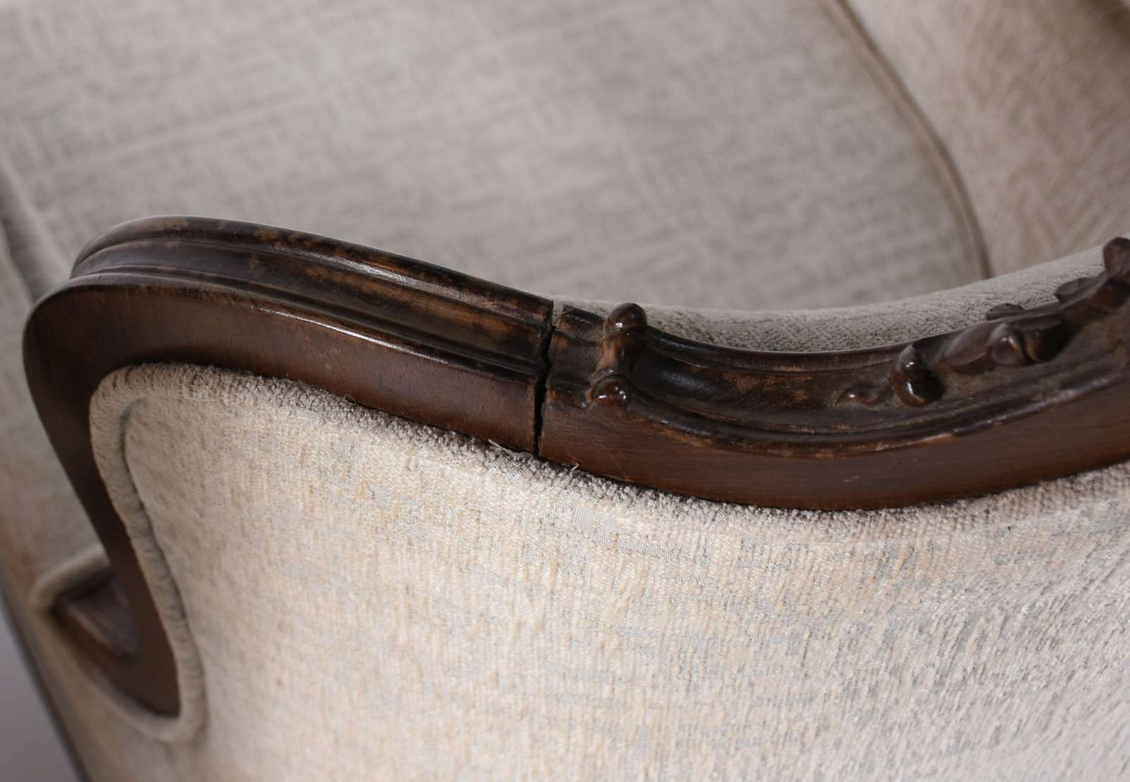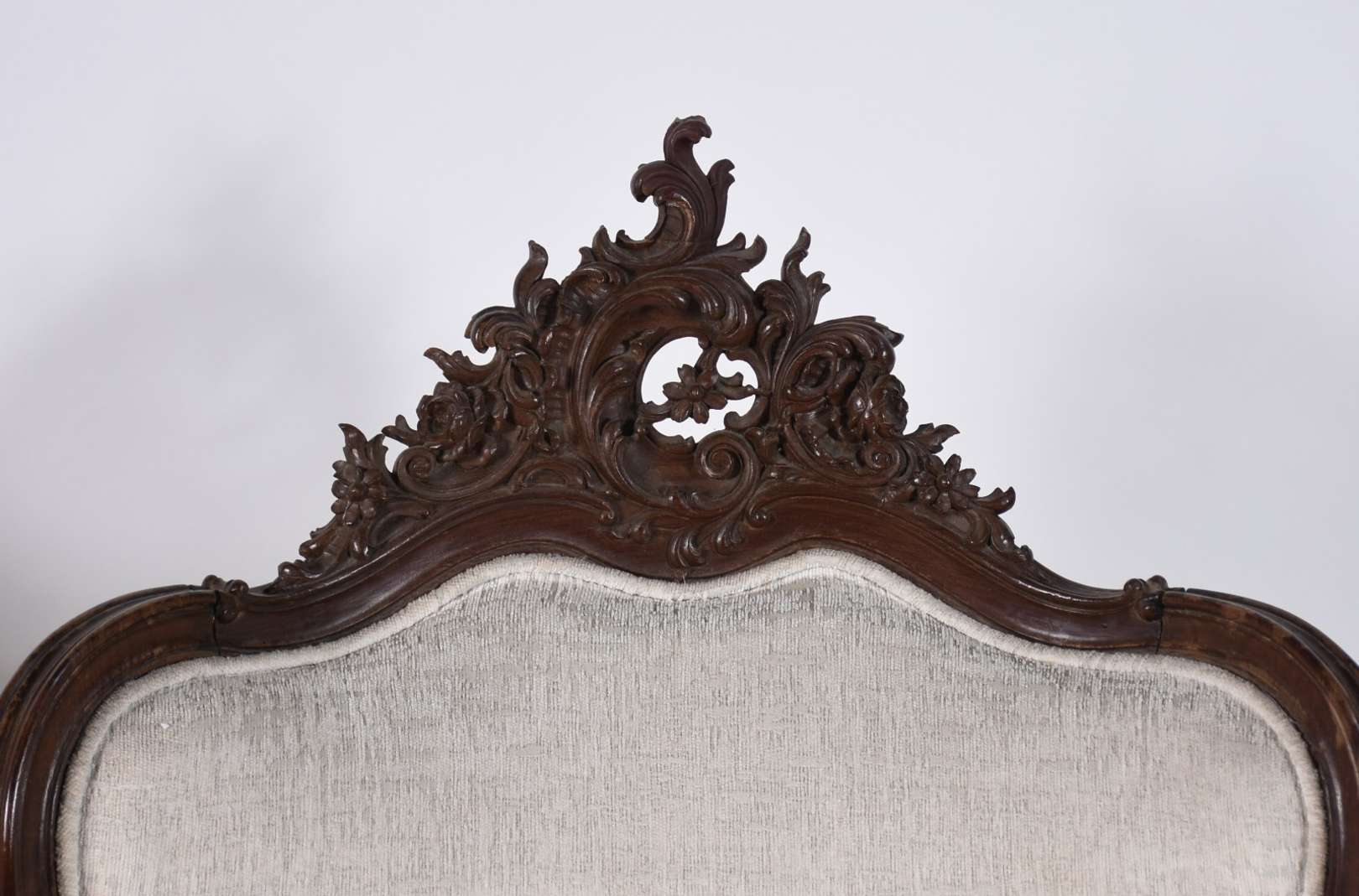 Belíssimo canapé recamier de jacarandá, terminações em curvas ligadas por hastes torneadas, assento e semi encosto de...