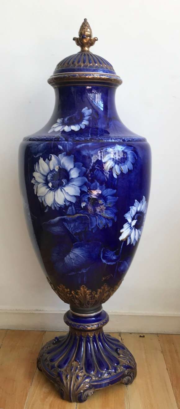 Jarrão europeu de faiança azul floral com detalhes dourados. Marcas na base.