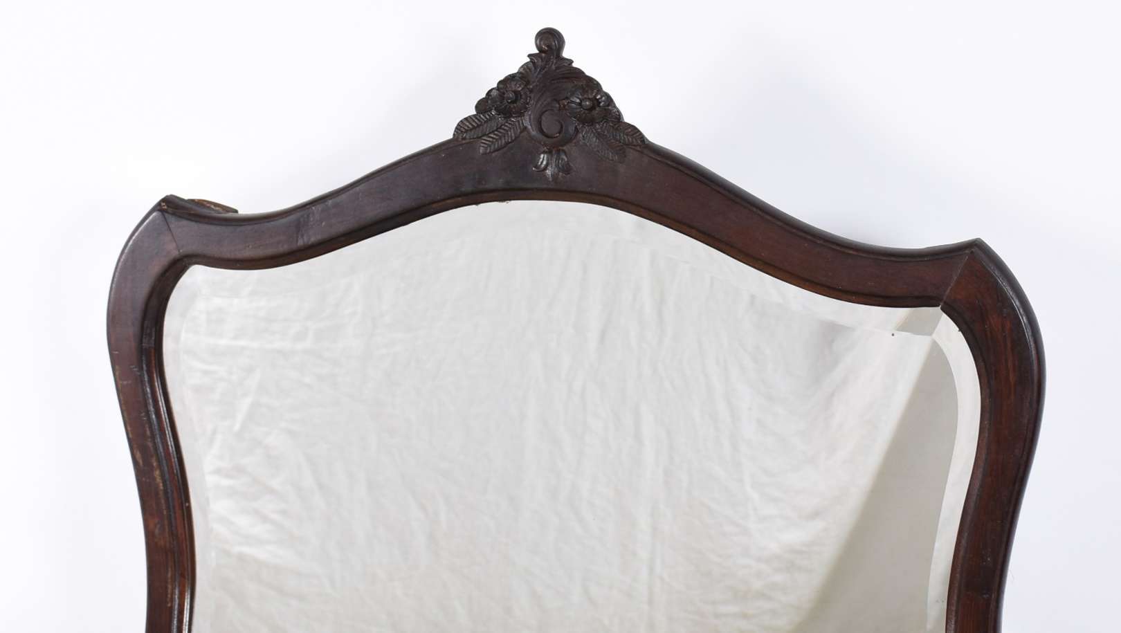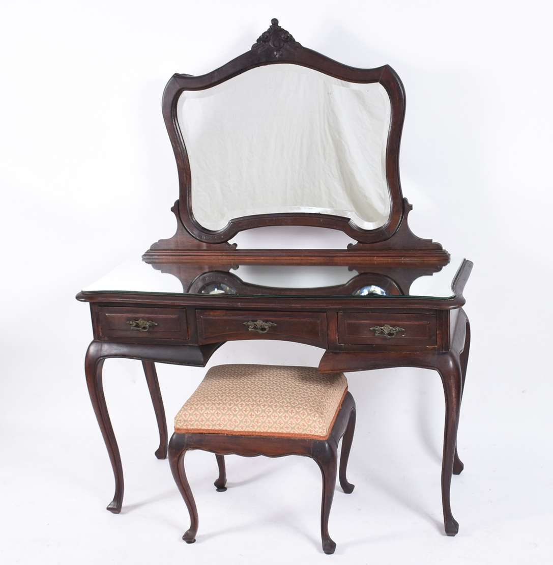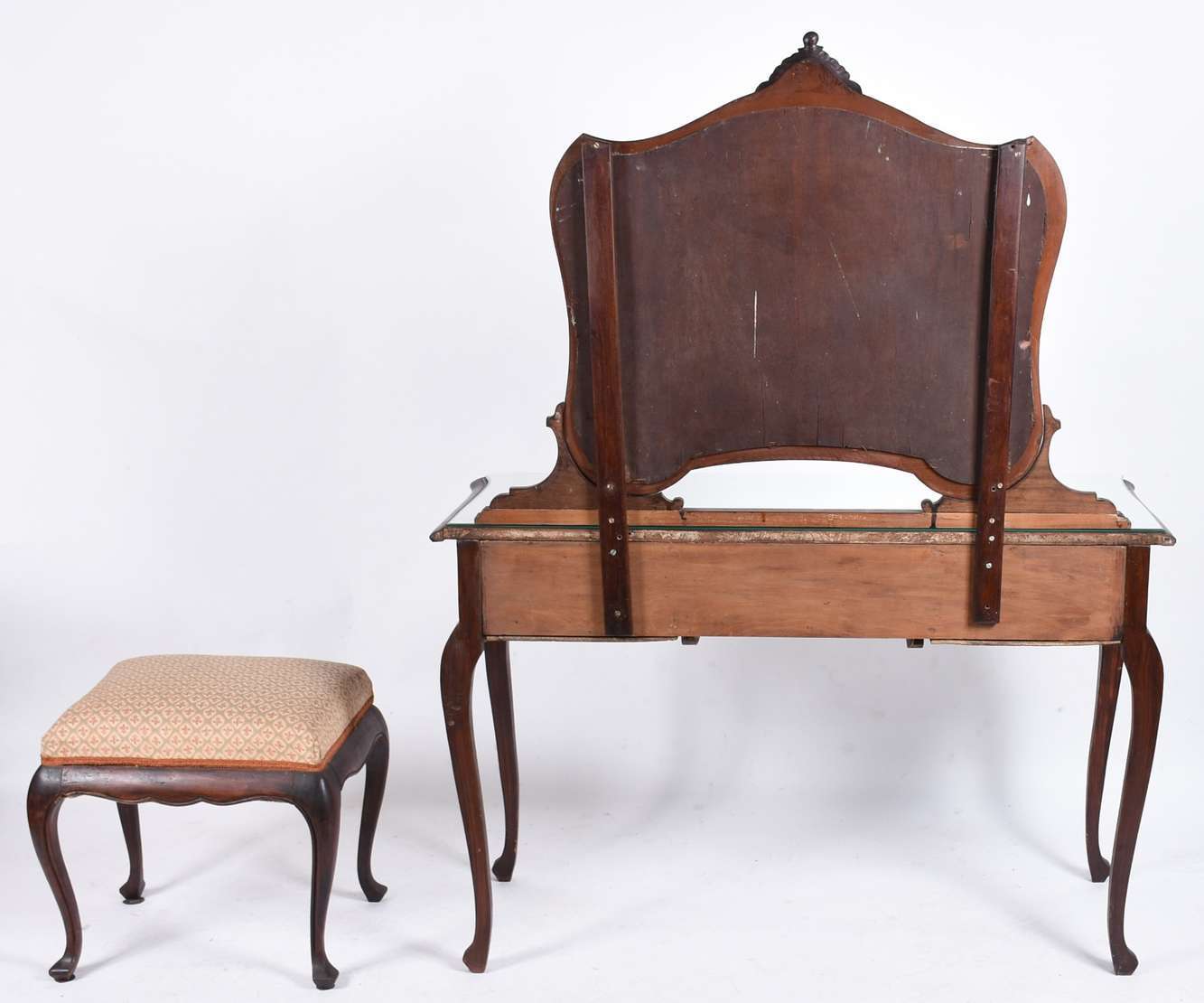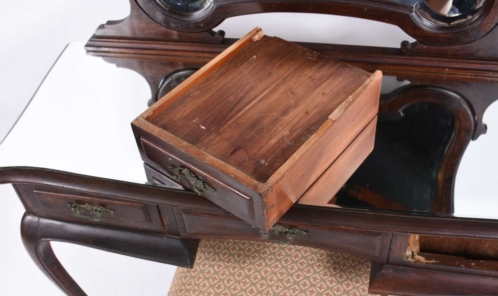 Mesa de encostar de madeira nobre com 2 gavetas emolduradas, puxadores de metal, pequena aba recortada com entalhes r...