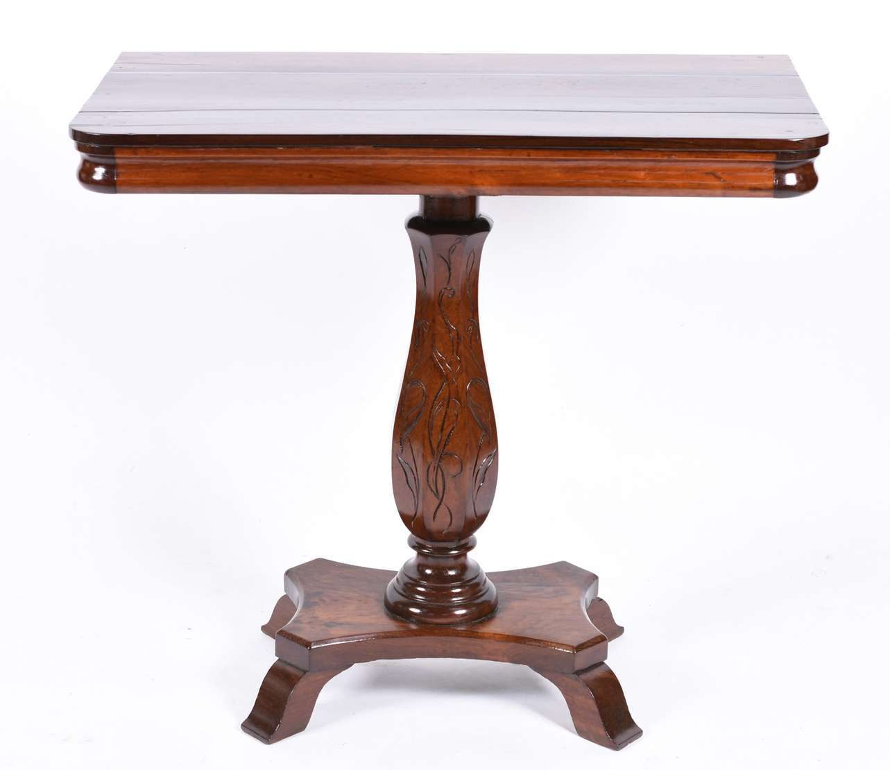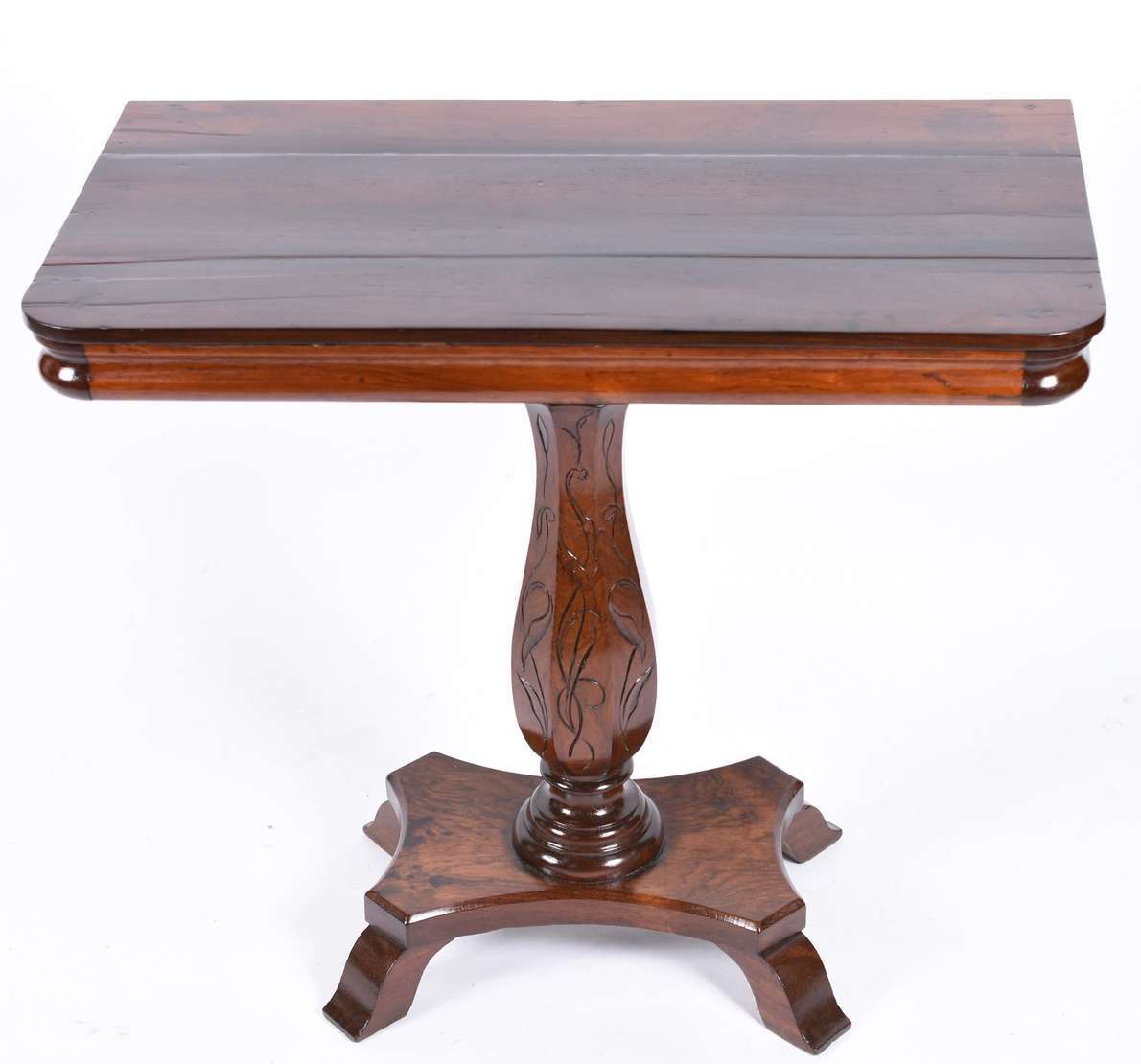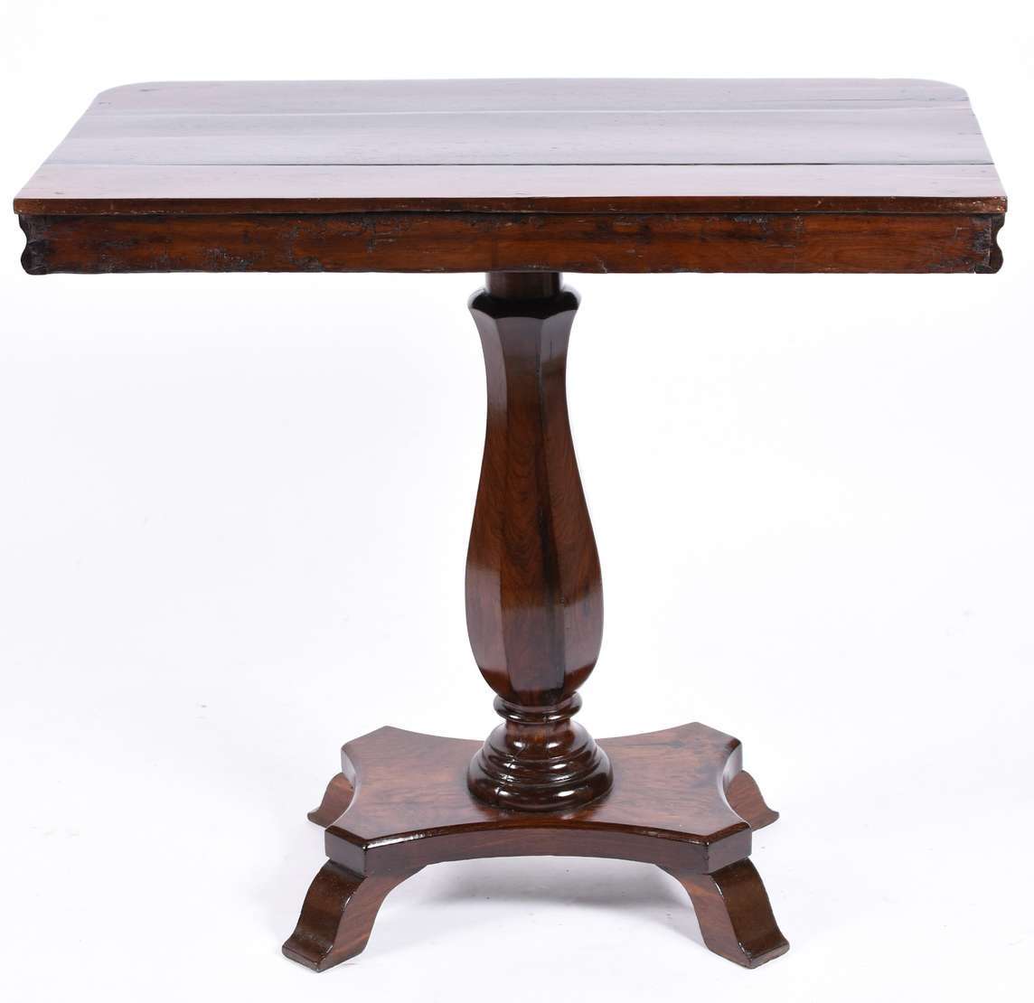 Mesa redonda de madeira nobre, base em três pernas torneadas arrematadas por pino central.