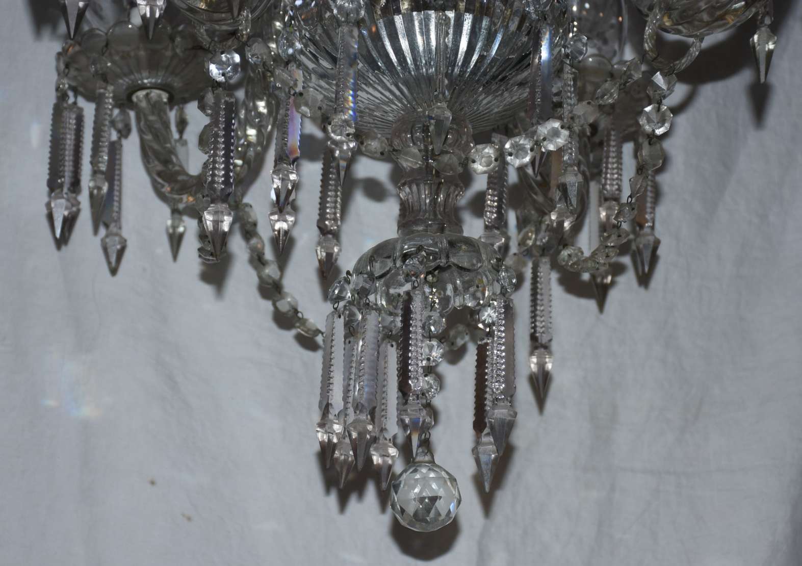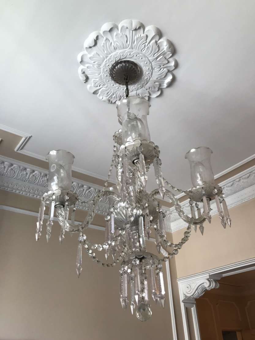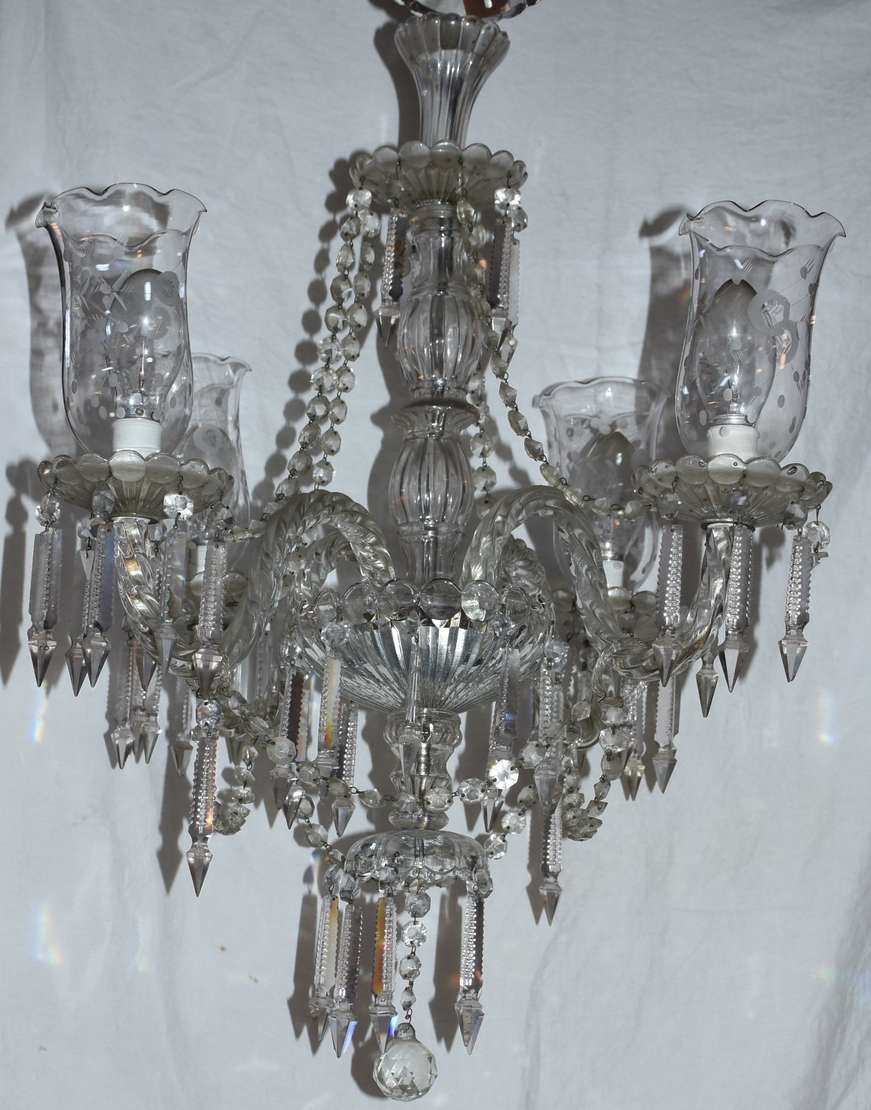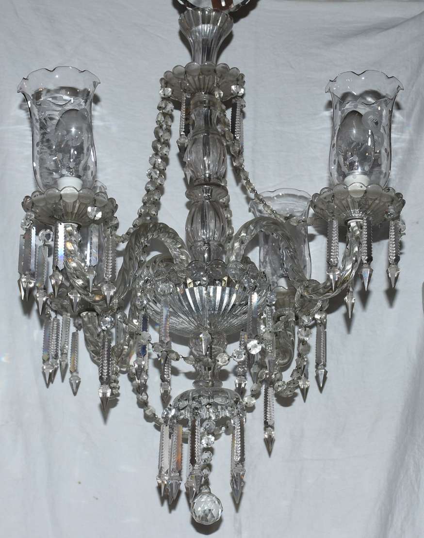 Lustre de metal dourado com tres braços e mangas de cristal.