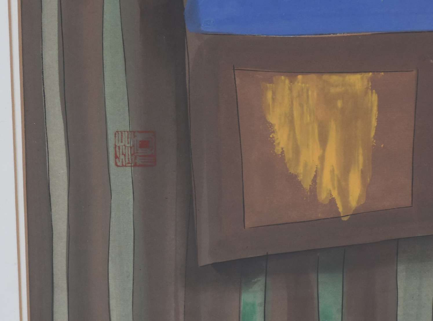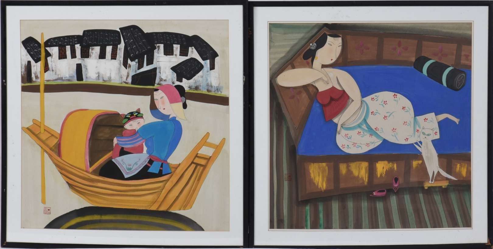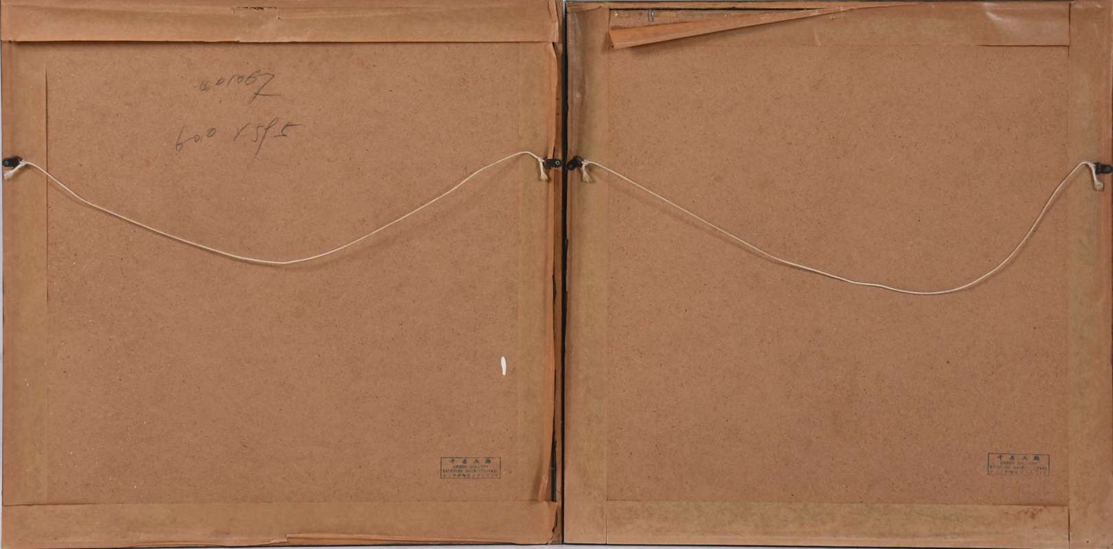 Par de quadros chineses decorados com figuras típicas sobre material calcáreo (com quebrados).