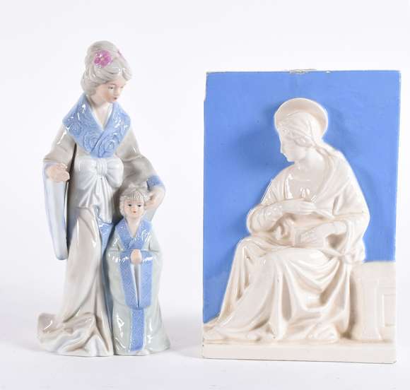 Duas peças de porcelana, sendo: grupo escultórico espanhol "Capo di Angelo" representando gueixa com criança e placa ...