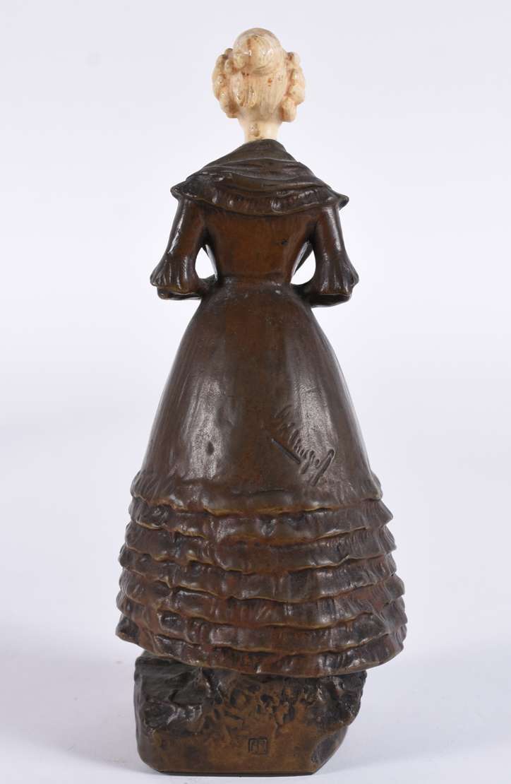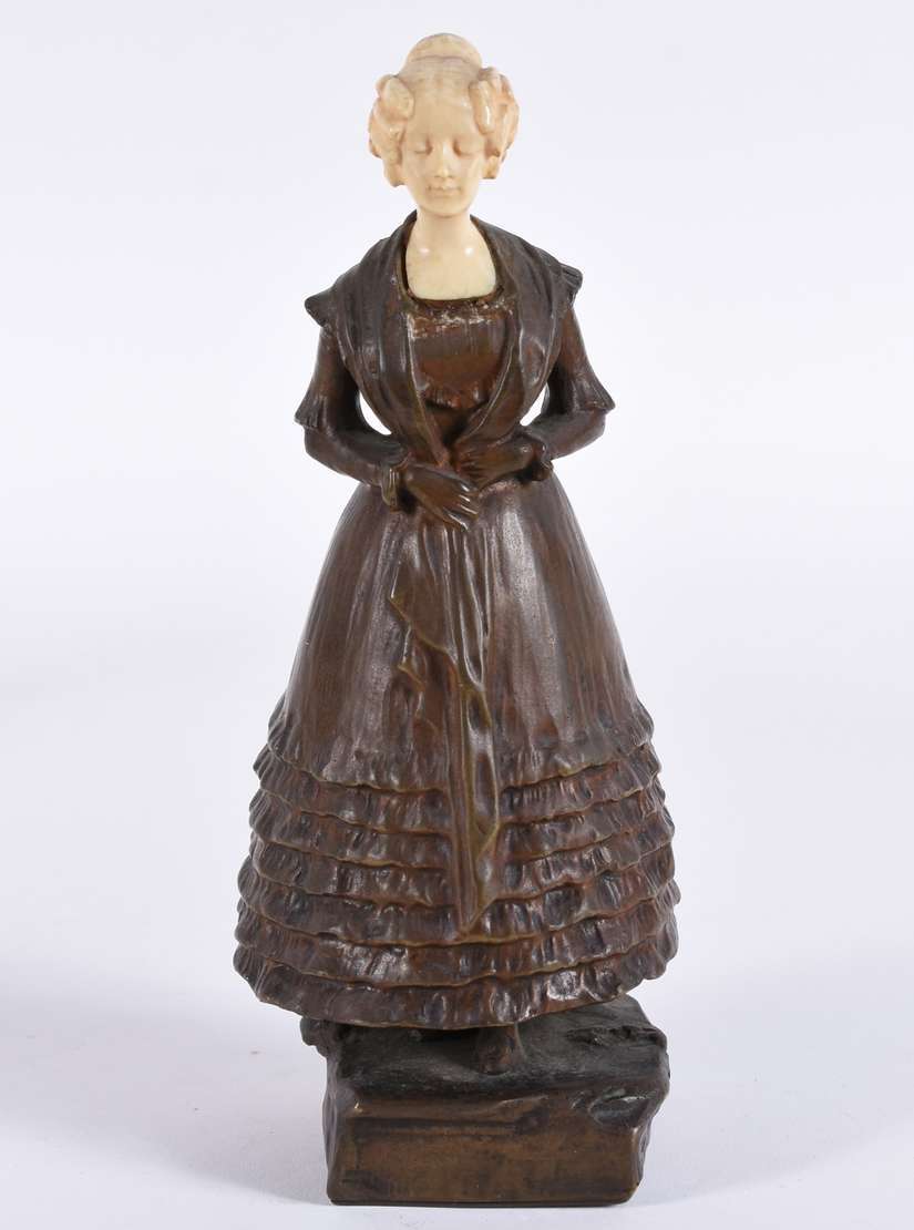 Duas pequenas esculturas de metal representando camponesas, bases de mármore. Desgastes no metal e uma com parte queb...