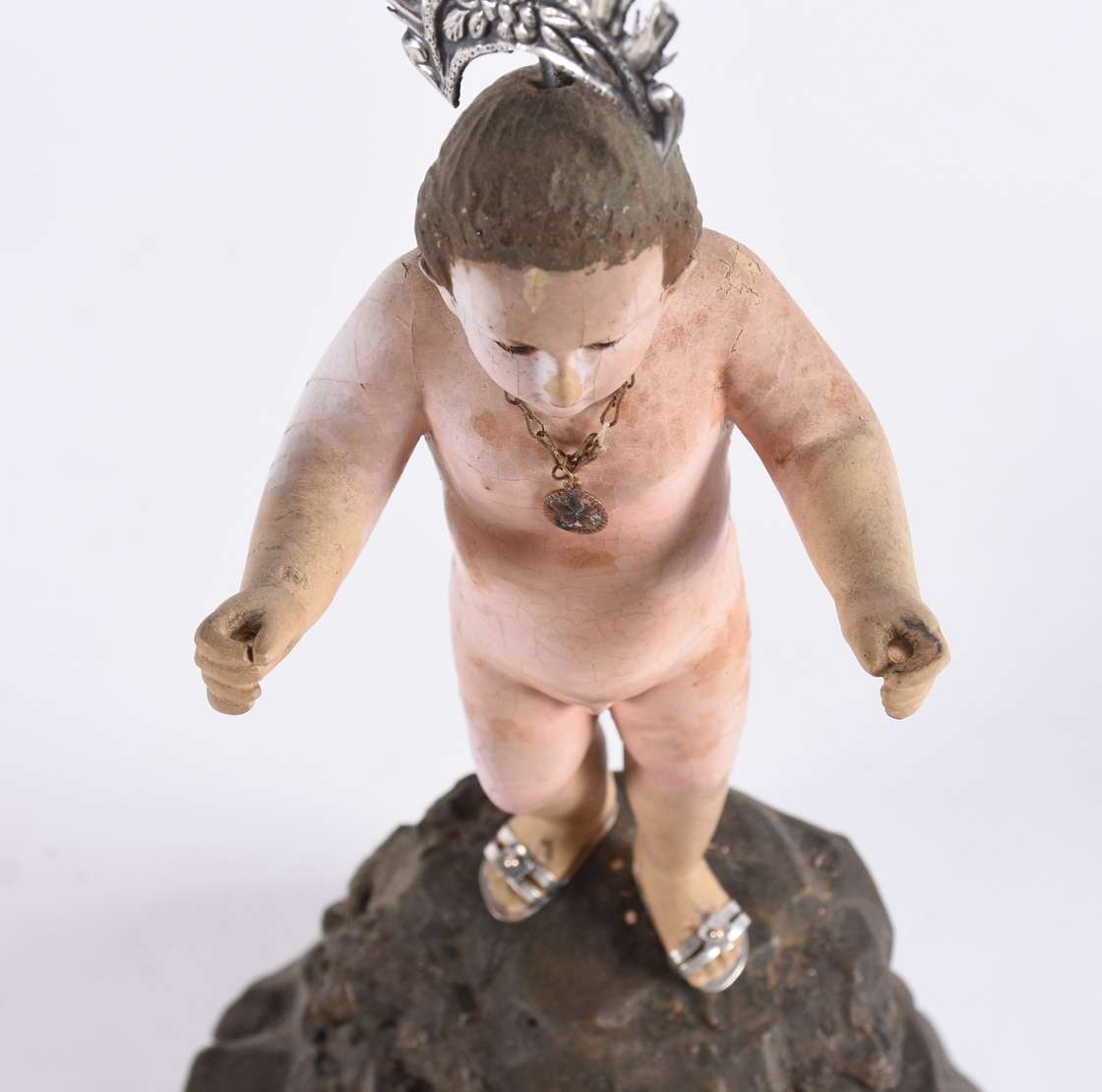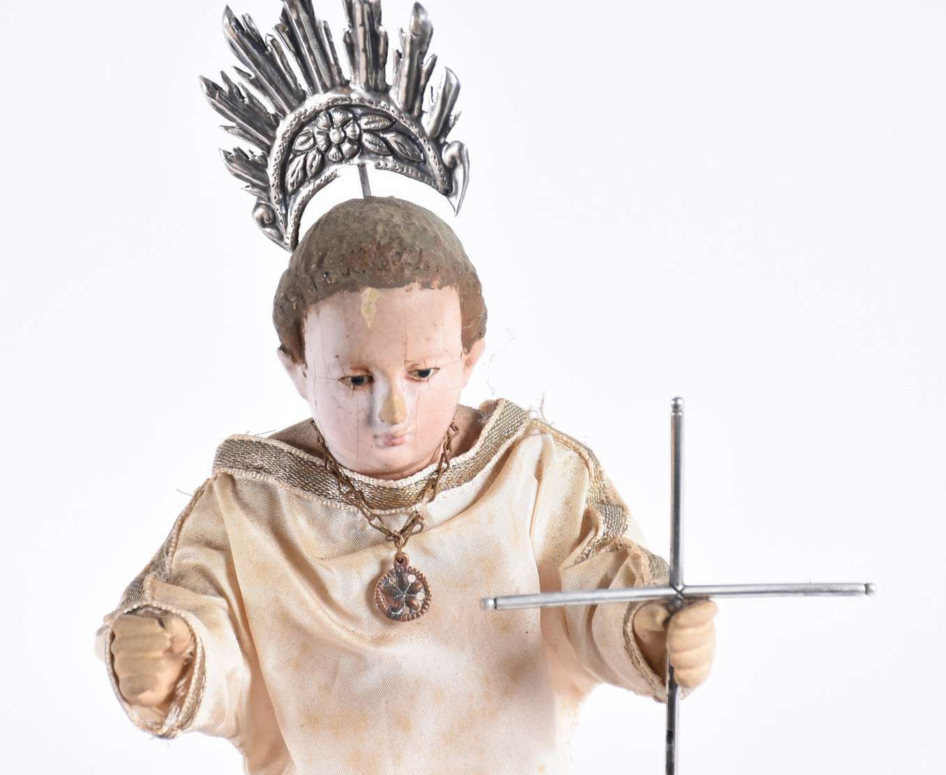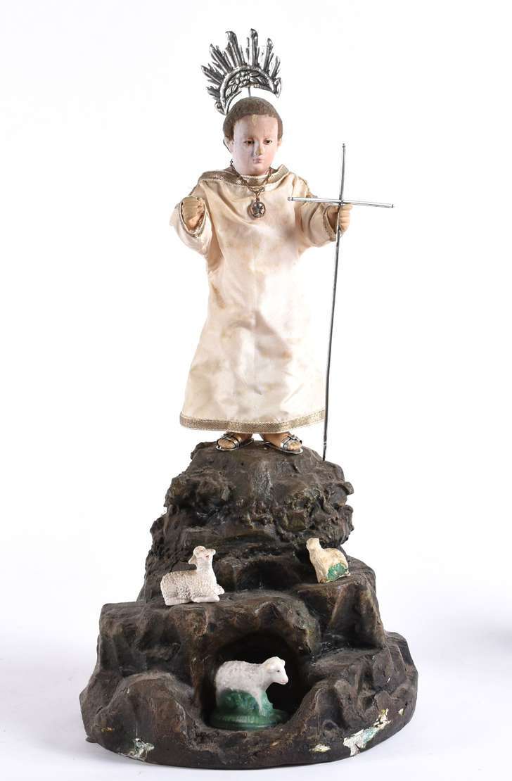 Menino Deus no monte - Imagem de madeira policromada, resplendor, cruz e sandalinhas de prata. Carneirinhos de enfeite em material sintético.