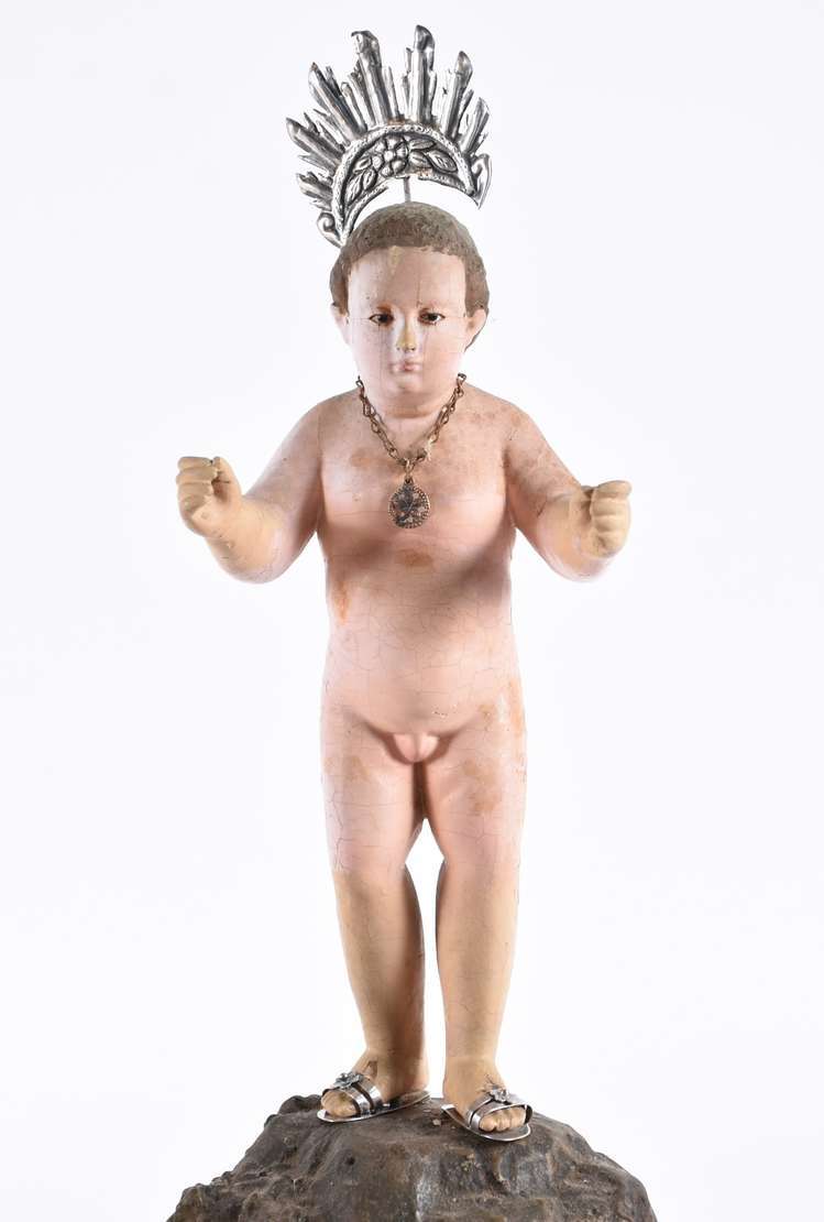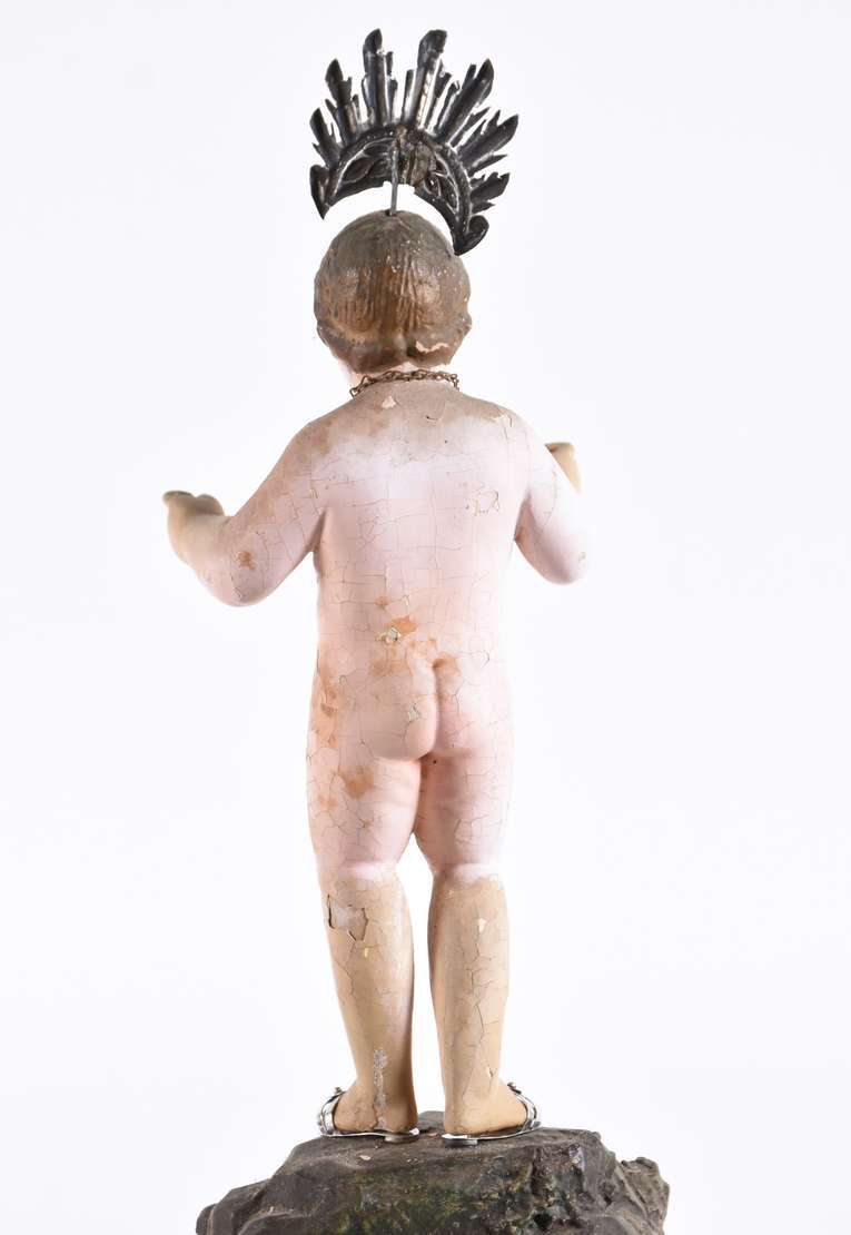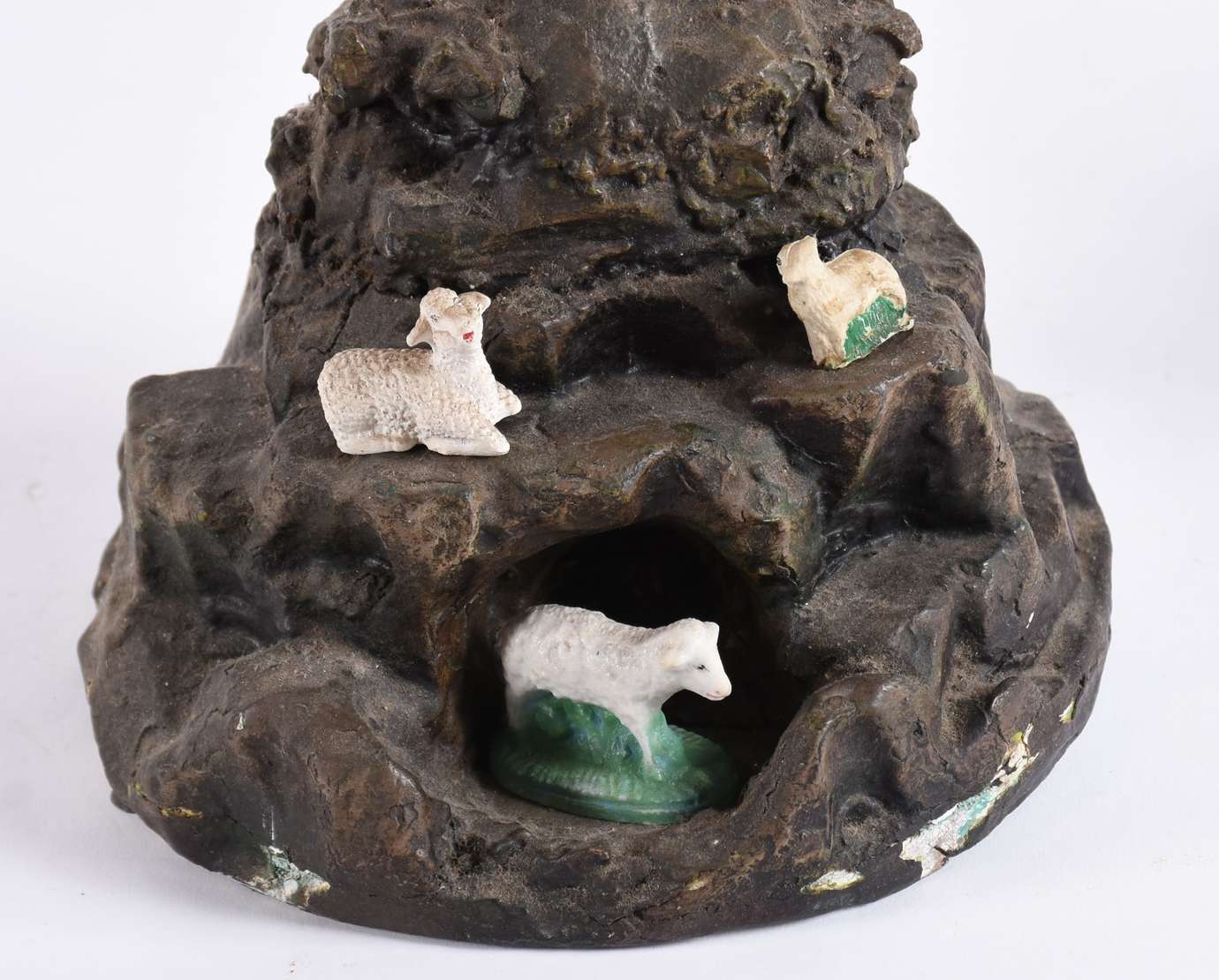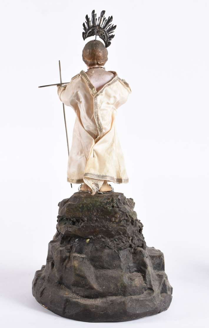 Menino Deus no monte - Imagem de madeira policromada, resplendor, cruz e sandalinhas de prata. Carneirinhos de enfeite em material sintético.