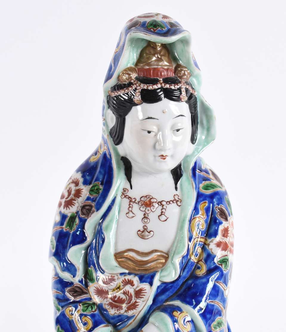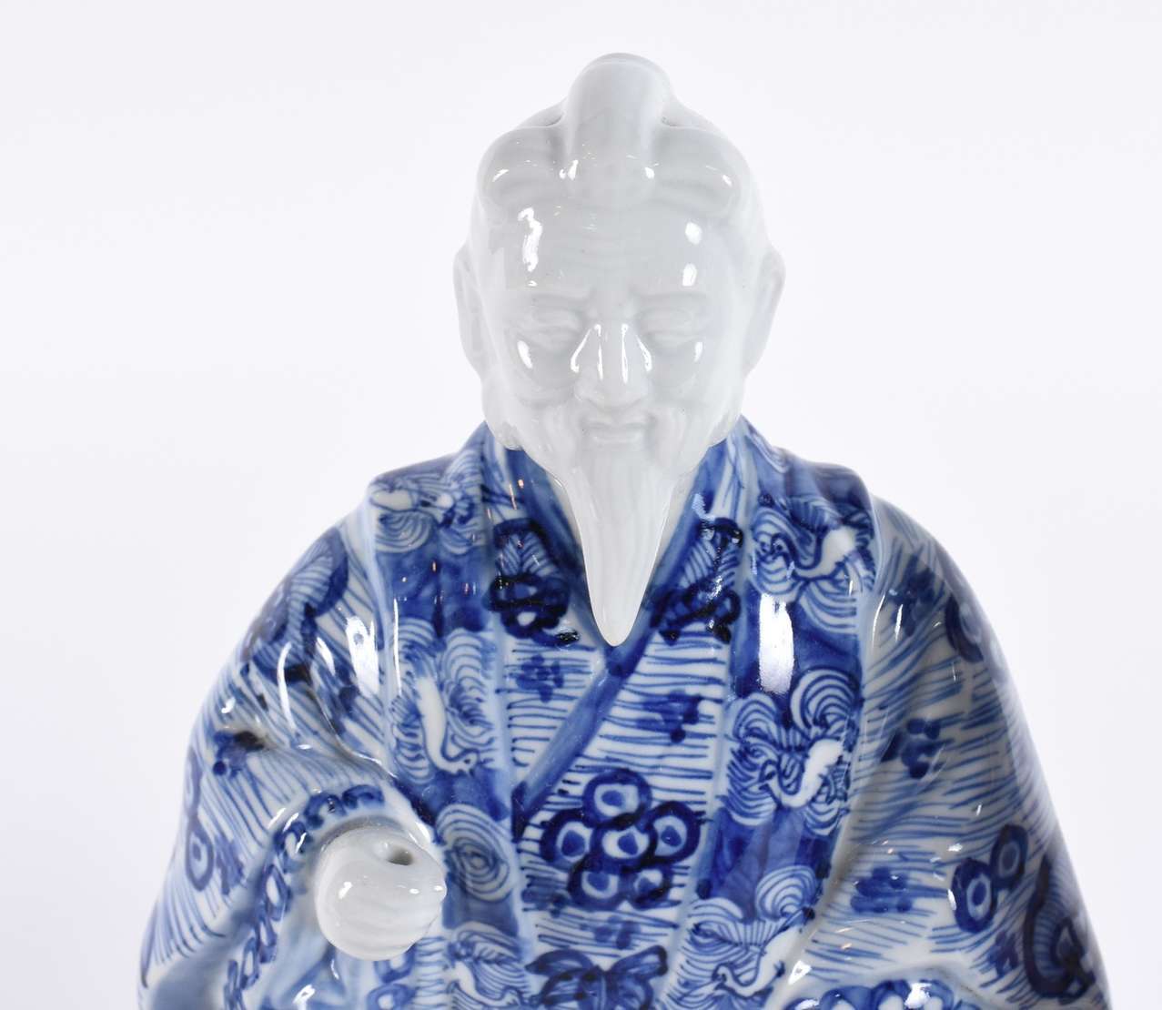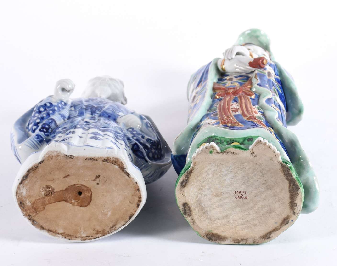 Duas esculturas de porcelana japonesa policromada representando gueixa e sábio.