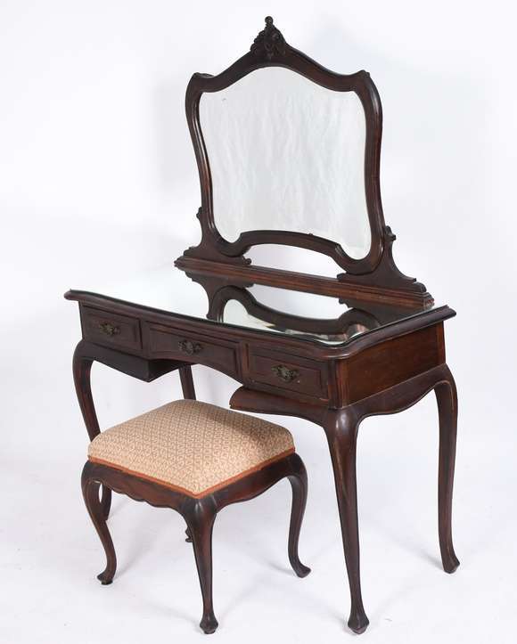 Penteadeira de madeira nobre no estilo Chipendale, corpo com tres gavetas e saia recortada, alçada com espelho bisota...