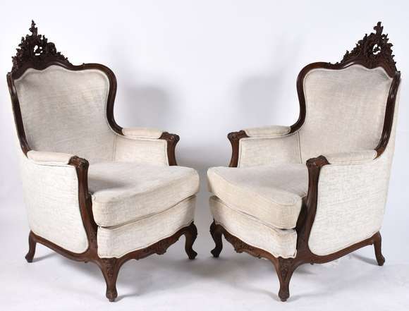Par de imponentes poltronas de madeira nobre, parte superior com rico trabalho entalhado, estilo Luis XV, estofamento...