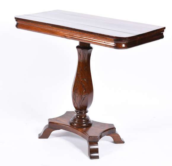 Mesa de encostar de madeira nobre, tampo retangular apoiado sobre coluna em balaústre, terminando em platô inferior c...