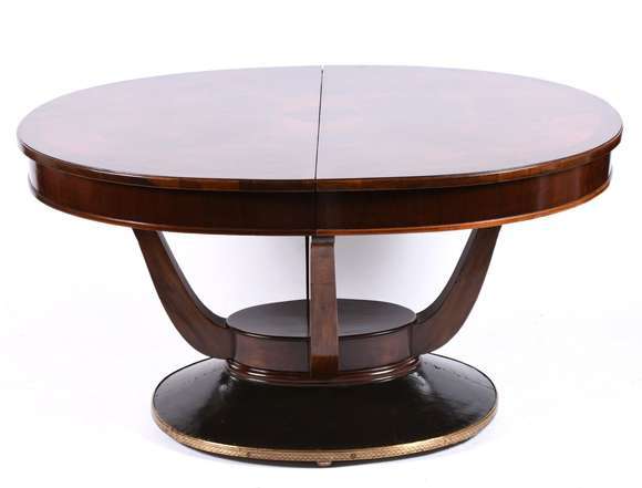 Mesa de jantar de madeira nobre, estilo Art Deco, tampo oval de rádica com divisão central, apoio em quatro traves re...