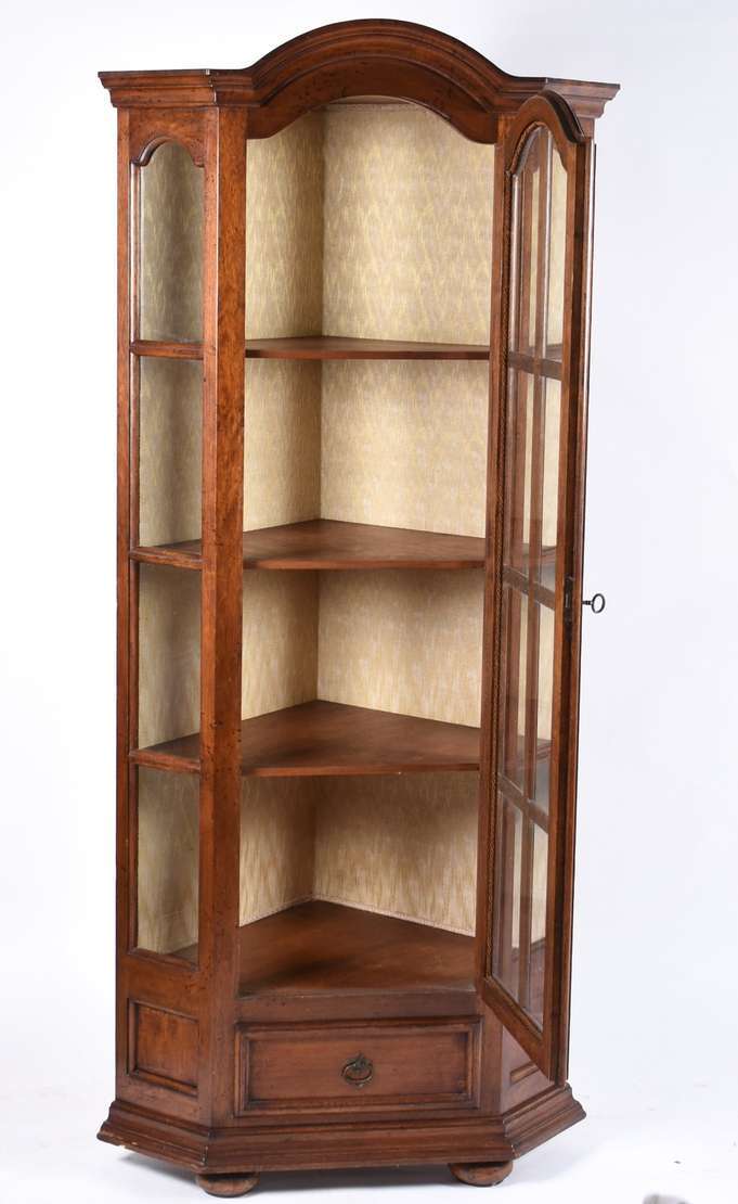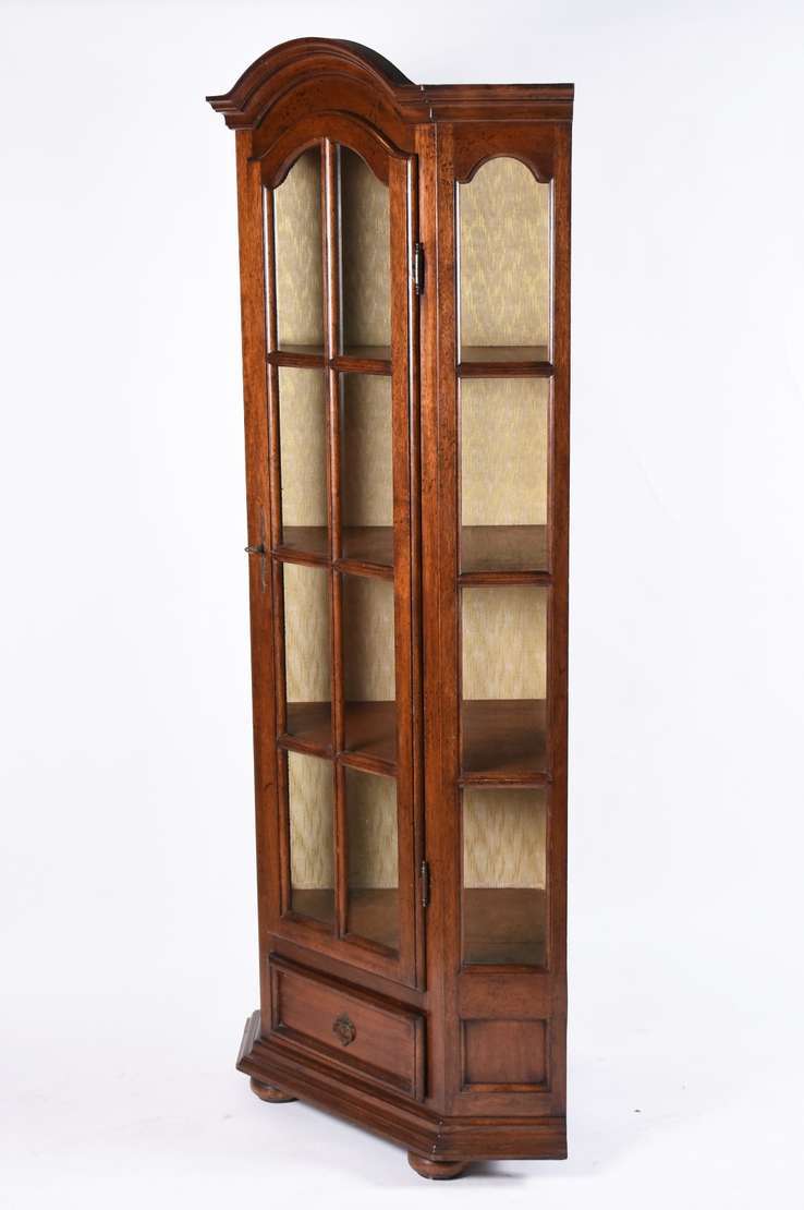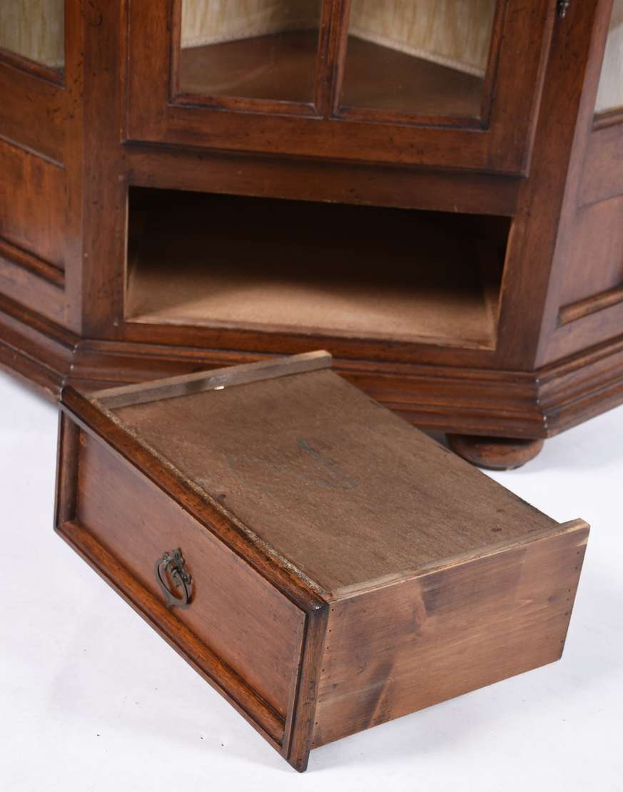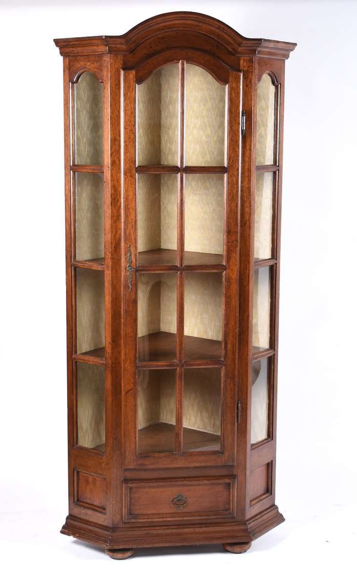 Móvel cristaleira de madeira nobre, parte inferior com duas gavetas sobre vão central e duas portas inferiores, quina...