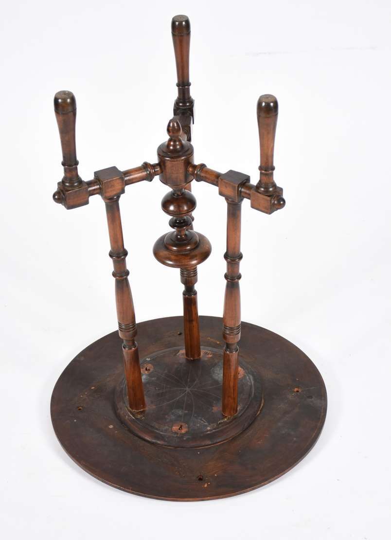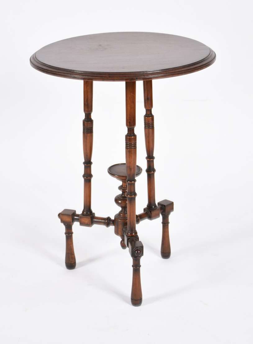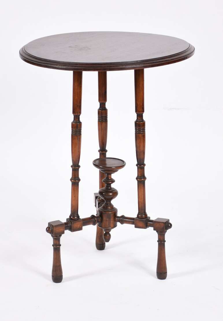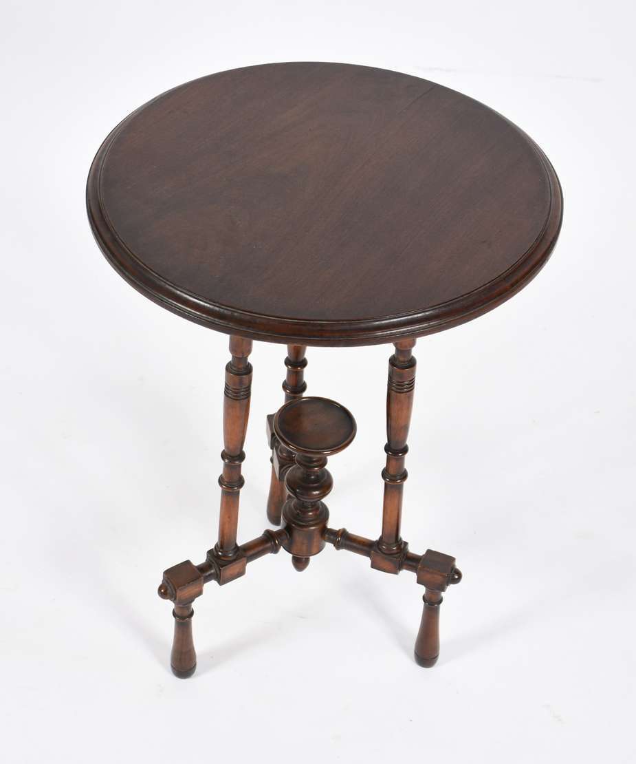 Mesa de madeira nobre, tampo redondo apoiado em coluna central torneada (pequeno defeito no pé).
