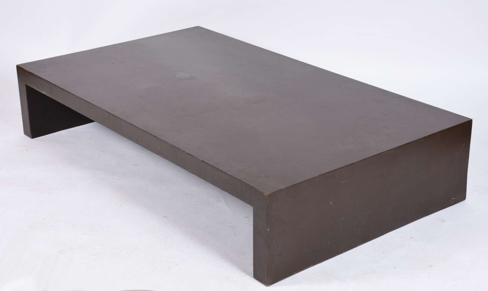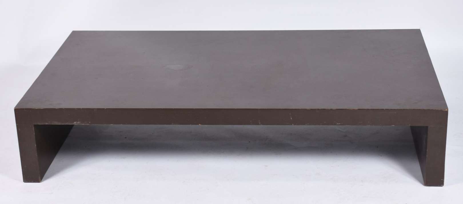 Mesa de apresentação de madeira nobre patinada em dourado, pernas cilíndricas frisadas ligada por traves recurvas na ...