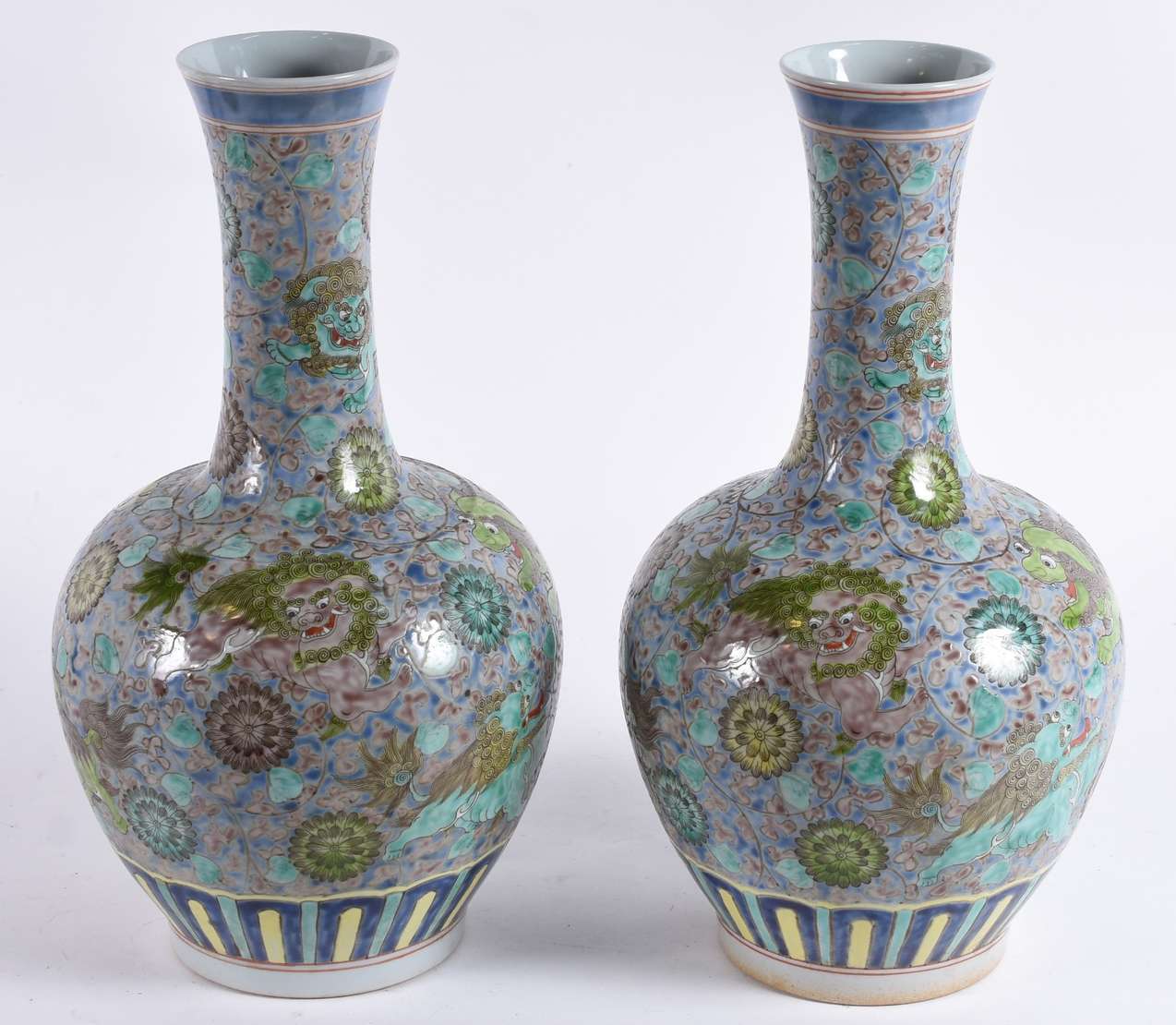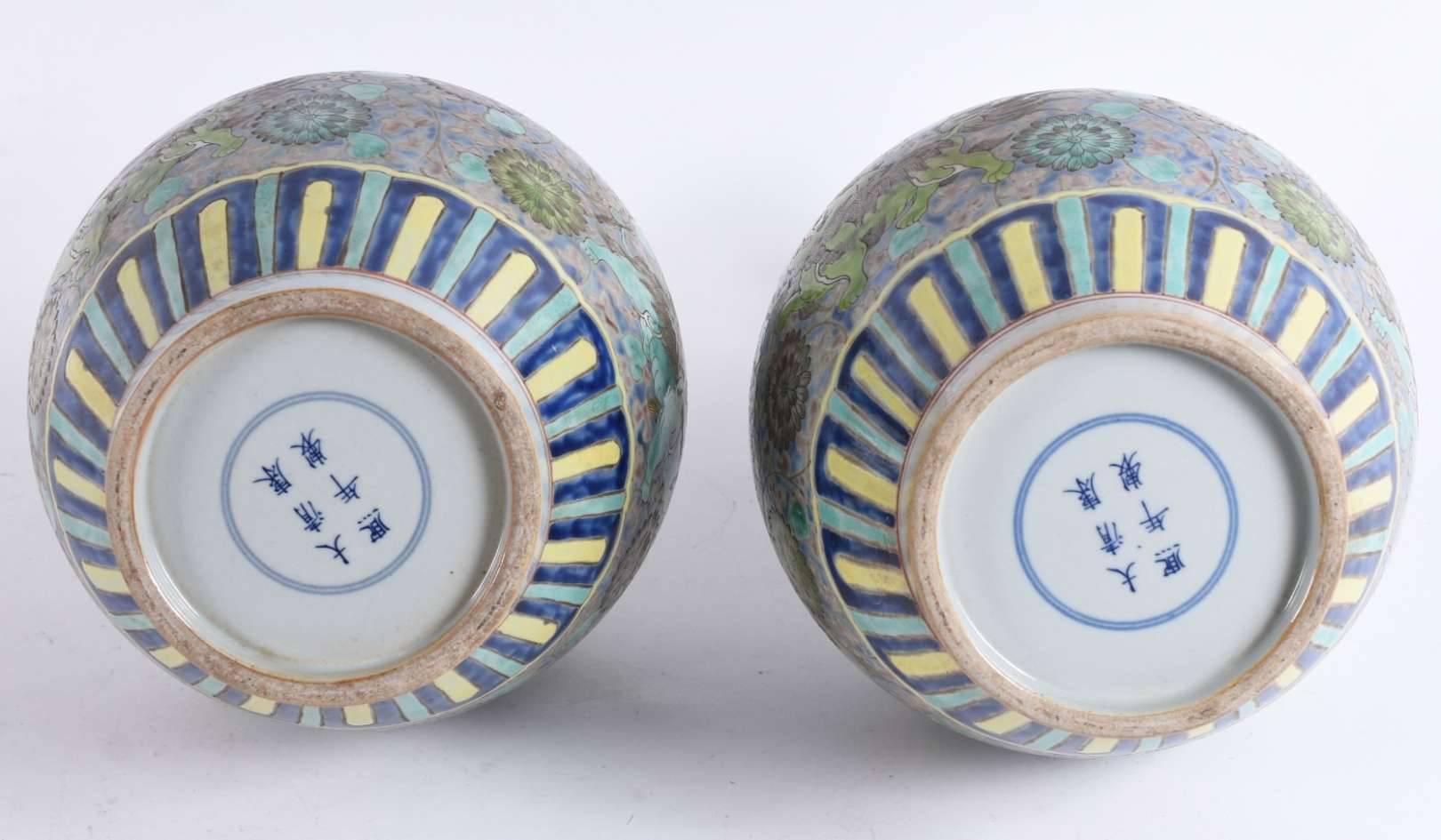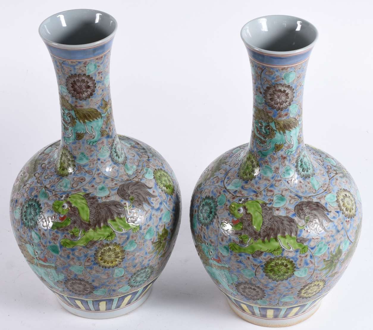 Par de vasos de porcelana azul cobalto com cenas românticas em policromia e realces dourados.