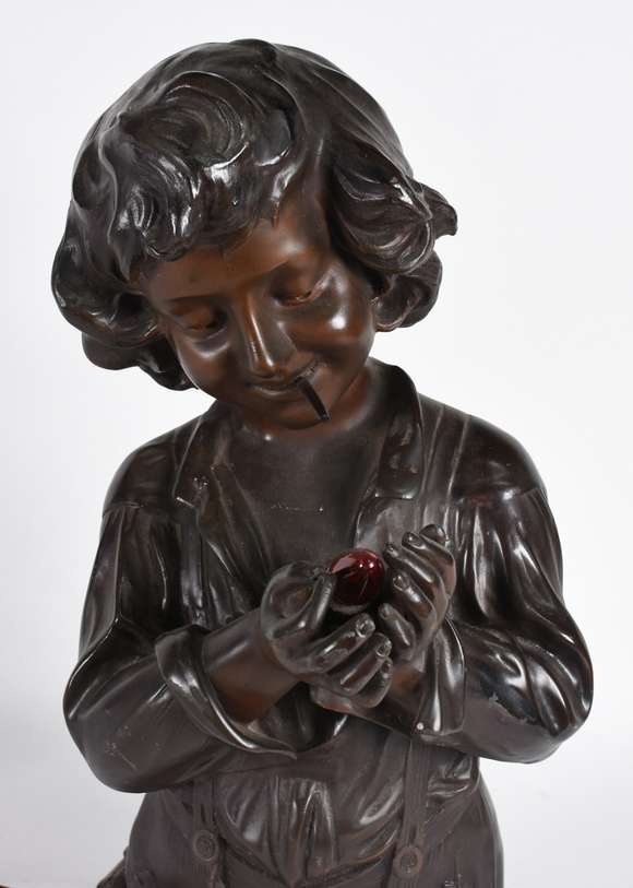 Duas peças, sendo lampião de metal dourado e escultura de bronze representando duas figuras sobre base de mármore pre...