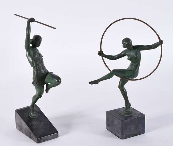 Duas esculturas ART DECO de bronze patinado de verde, sendo uma mulher com arco assinada Briand, e uma com lança, ass...