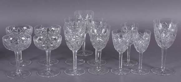 Conjunto com 13 cálices de cristal frances lapidado, sendo 4 taças para champagne, 4 taças para vinho tinto, e para v...