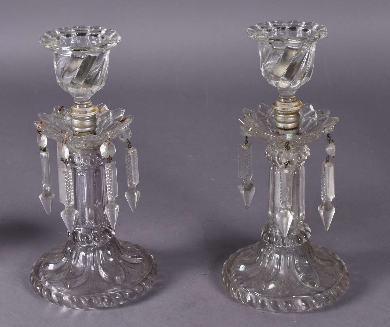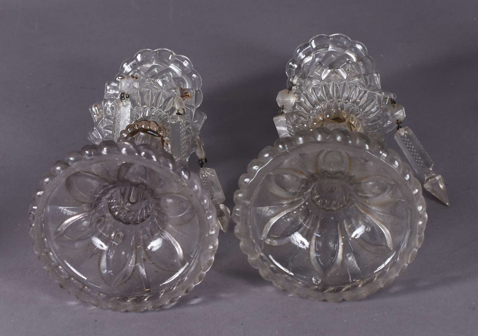 Par de apliques de metal com pingentes lapidados e para 3 luzes.