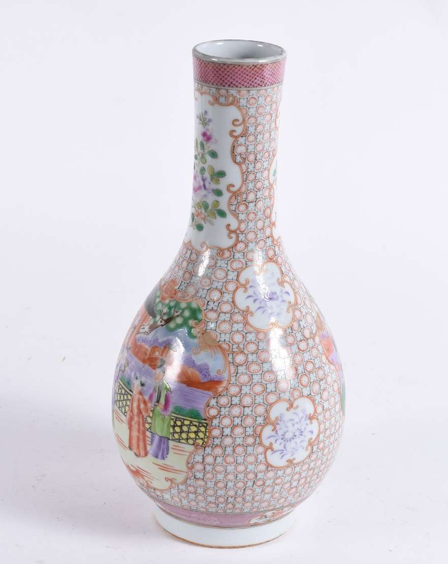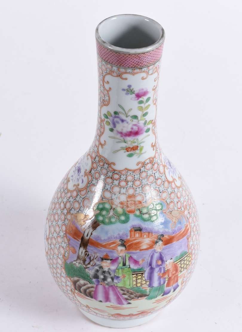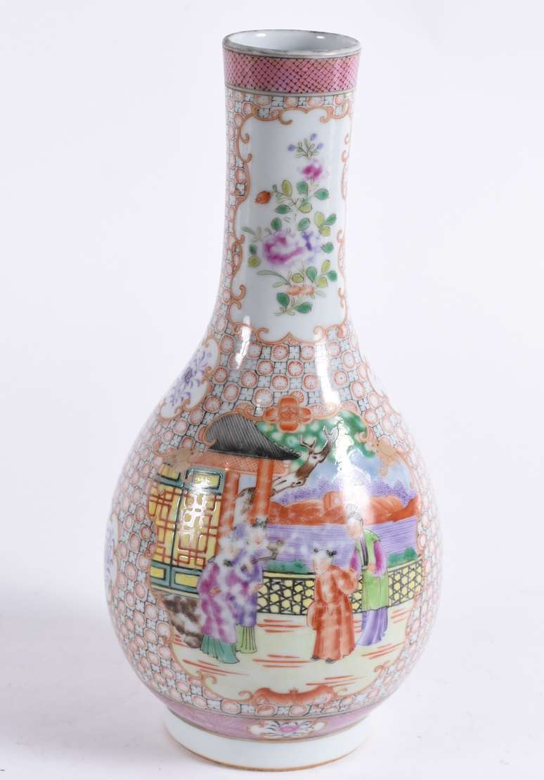 Par de vasos em porcelana chinesa de formato “rouleau”,decorados em azul cobalto com dignitários e atendentes em jard...