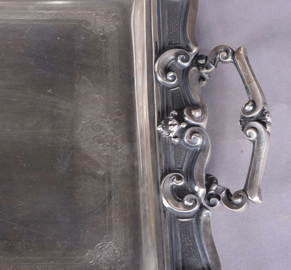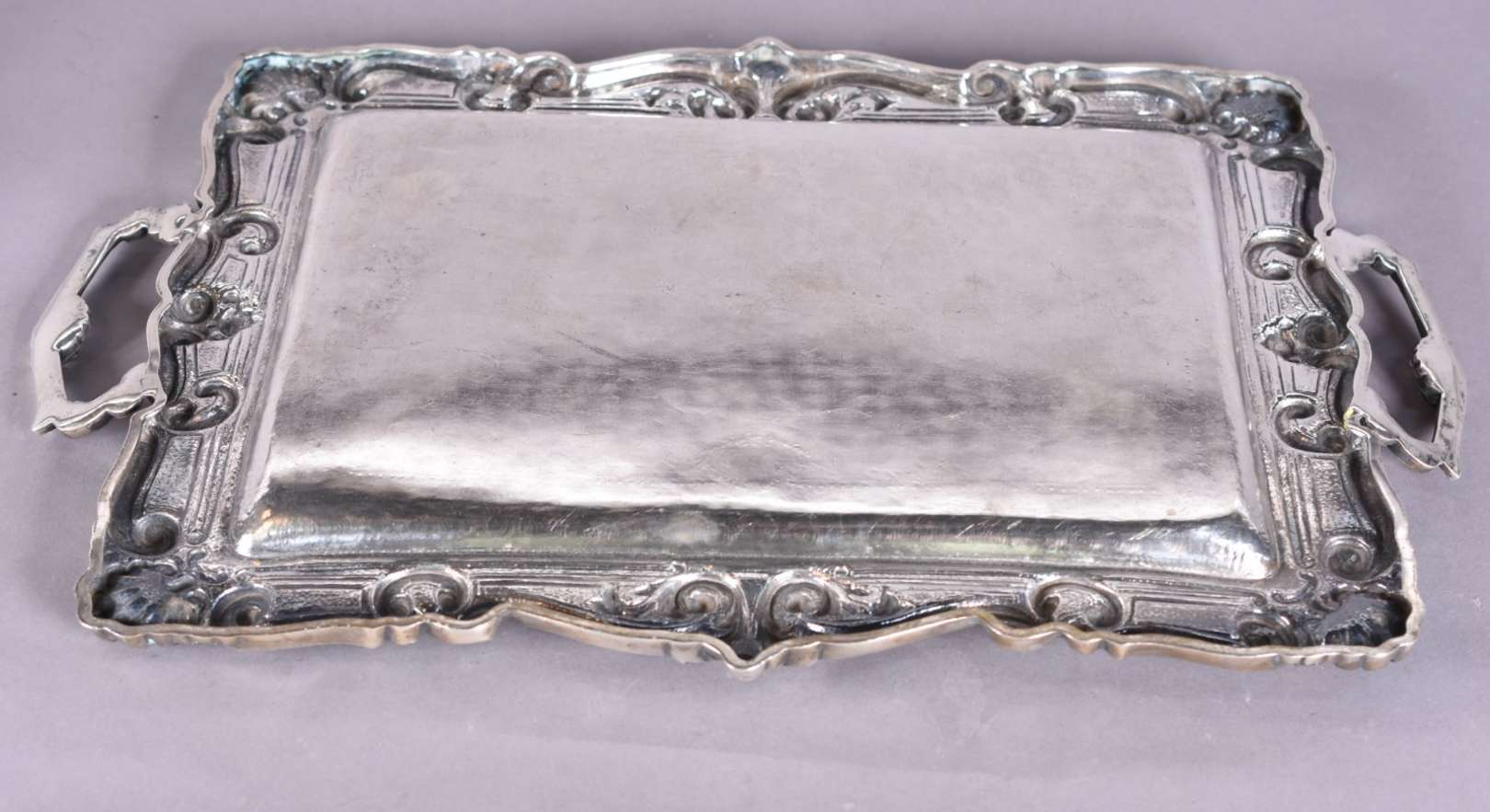 Excepcional bandeja de prata Portuguesa contraste de Lisboa, século XIX, galeria vazada, alças com figuras de peixes ...