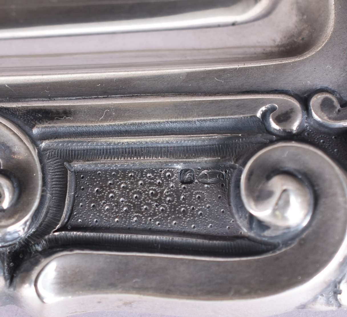 Salva de prata inglesa contrastada com leão passante, borda escalonada e recortada, fundo liso, apoio em três pés. P...