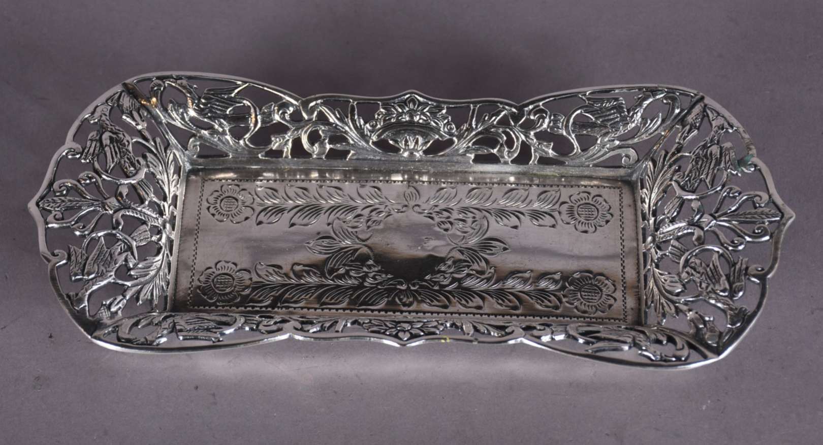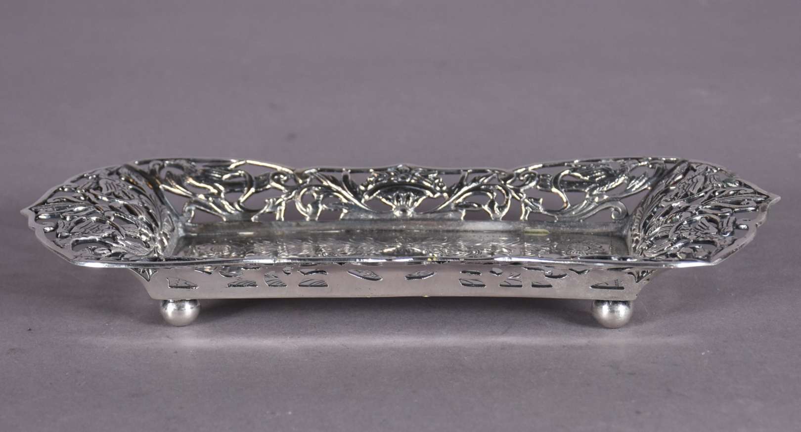Porta caviar de metal prateado feitio concha com bowl de vidro.