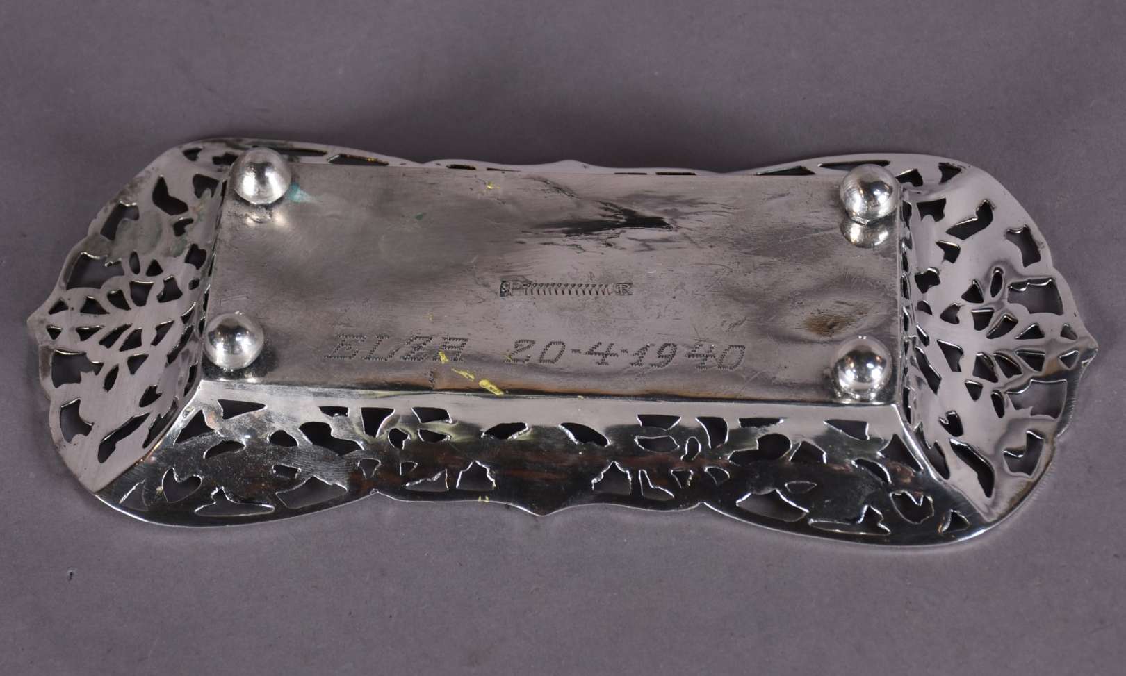 Duas peças, sendo: porta bloco de jacarandá com aplicações de prata e cinzeiro de prata MK 800 mls com moedas. Peso d...