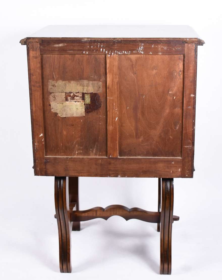 Mesa de encostar de jacarandá Dom José, uma gaveta com puxadores de metal, saia com entalhes rasos e ilhargas com dec...