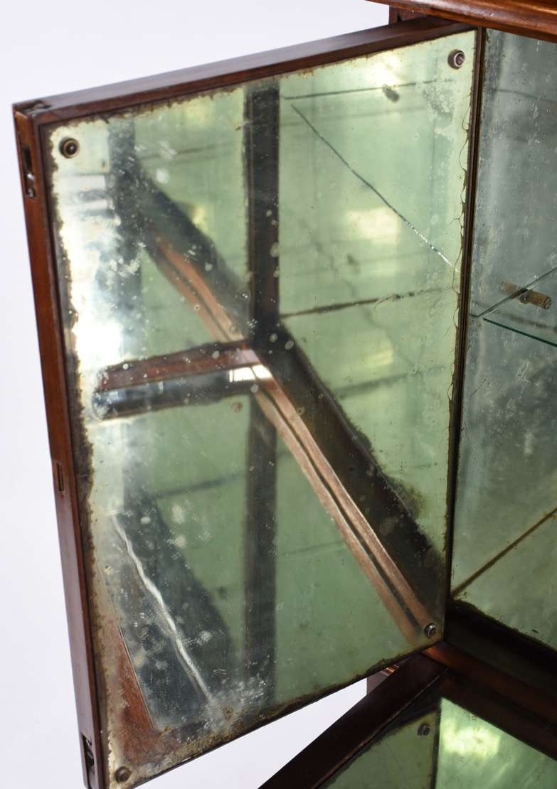 Vitrine de madeira nobre com porta e laterais de vidro, prateleiras internas, fundo forrado em tecido verde. Estilo I...