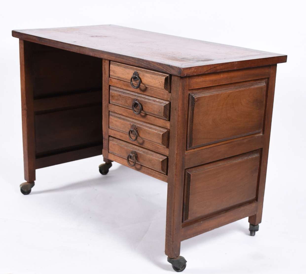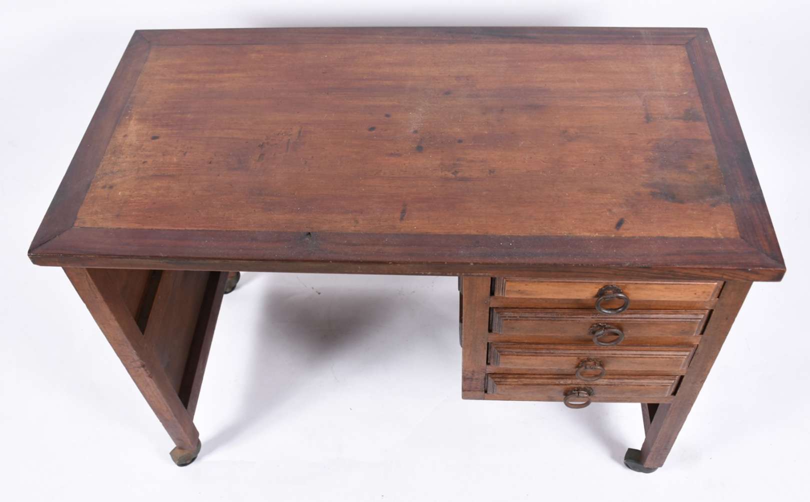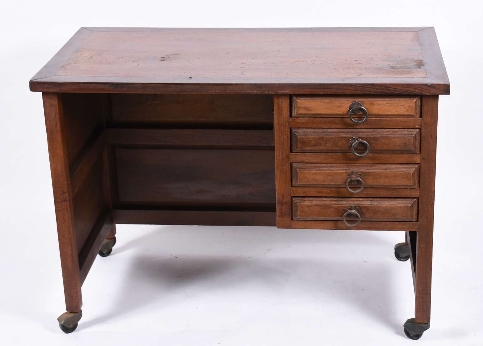 Mesa de encostar de jacarandá Dom José, uma gaveta com puxadores de metal, saia com entalhes rasos e ilhargas com dec...