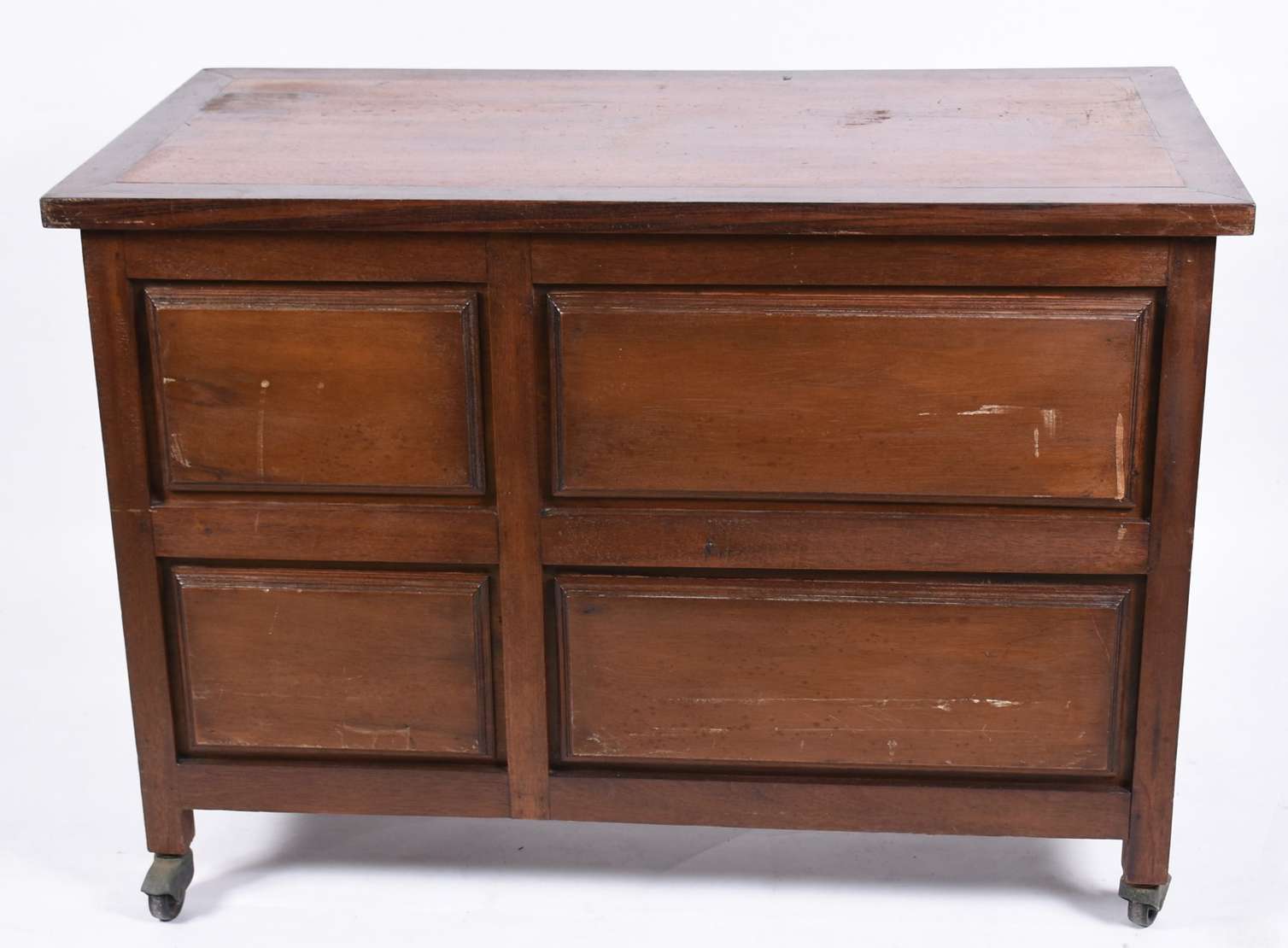 Carrinho de chá de madeira nobre, abas laterais, galeria com pinos torneados, sobre rodízios. Uma das pernas colada e...