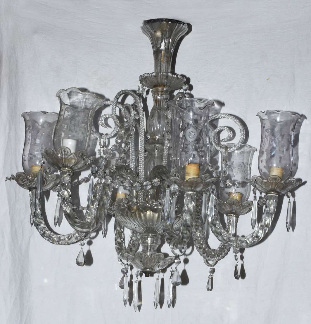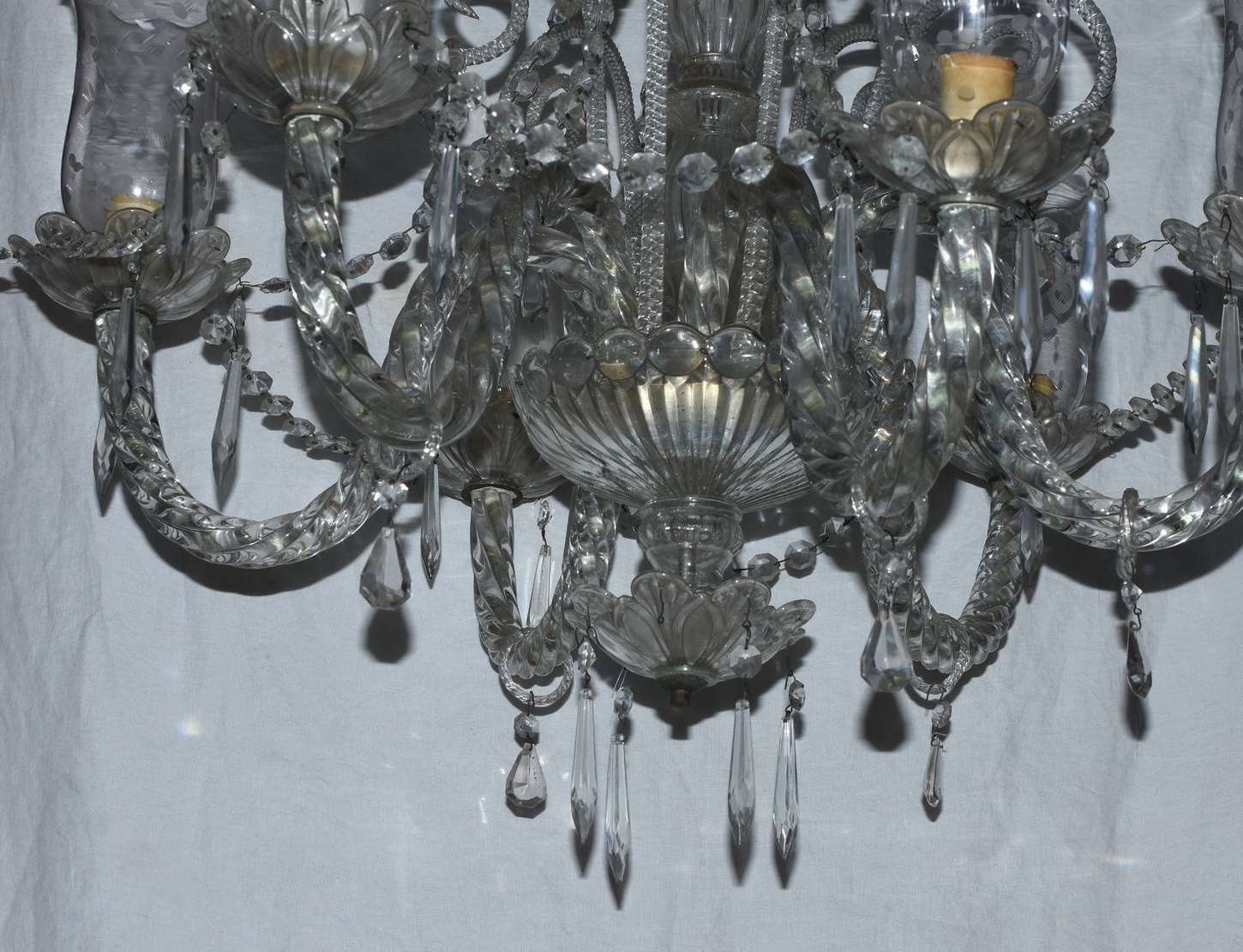 Excepcional lustre de crista francês para 10 luzes, bobeches com gregas lavradas, pingentes lapidados com detalhes na...
