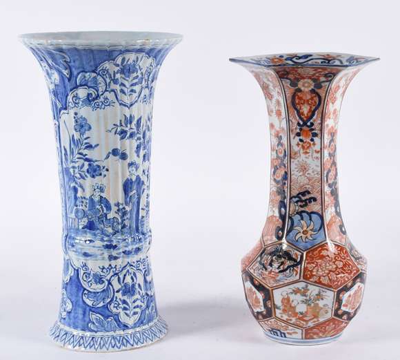 Lote arrematadoLote 608 - Ao vivo! Dois vasos de porcelana oriental, sendo um Imari feitio hexagonal assinado na base e outro cilíndrico em gomos decora... 36 cm / 33 cm