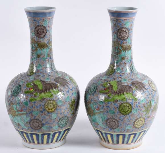 Não vendidoLote 108 - Ao vivo! Par de vasos em porcelana chinesa de formato globular, comlongos gargalos, ornados em policromia da Famille Verte por... 41 cm